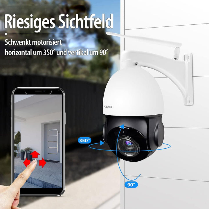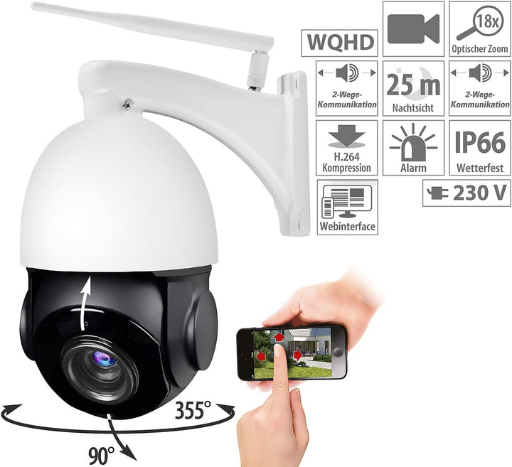 - 18-fach optischer Zoom für bestes Bild auch beim Vergrössern • Extrahohe 2K-Auflösung mit 2560 x 1440 Pixeln (WQHD) • Riesiges 360°-Sichtfeld dank Pan-Tilt-Funktion • Integrierte Sirene mit 85 dB lautem Alarm • Kostenlose App ELESION für