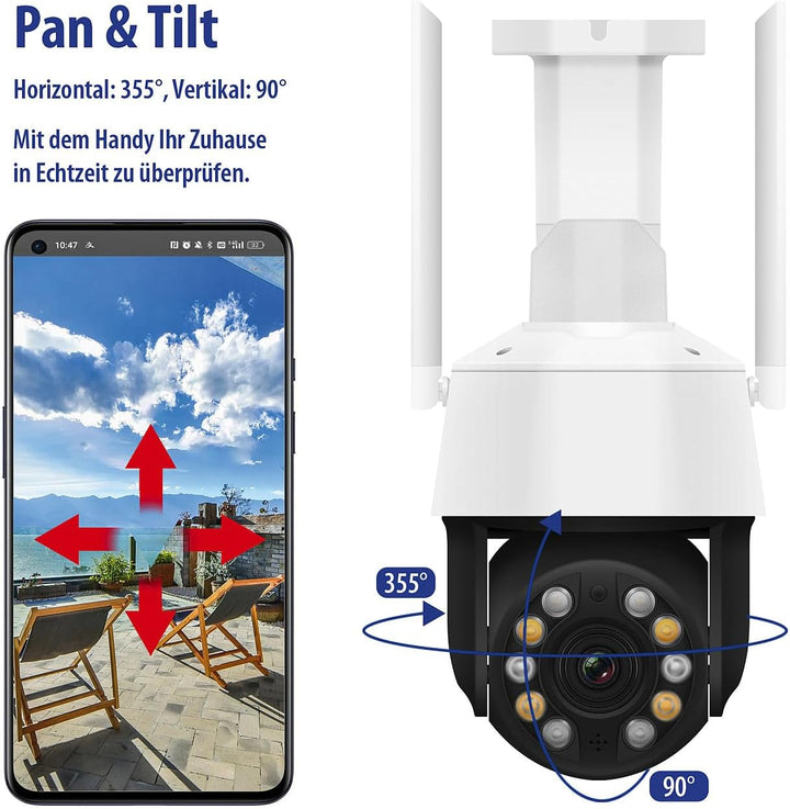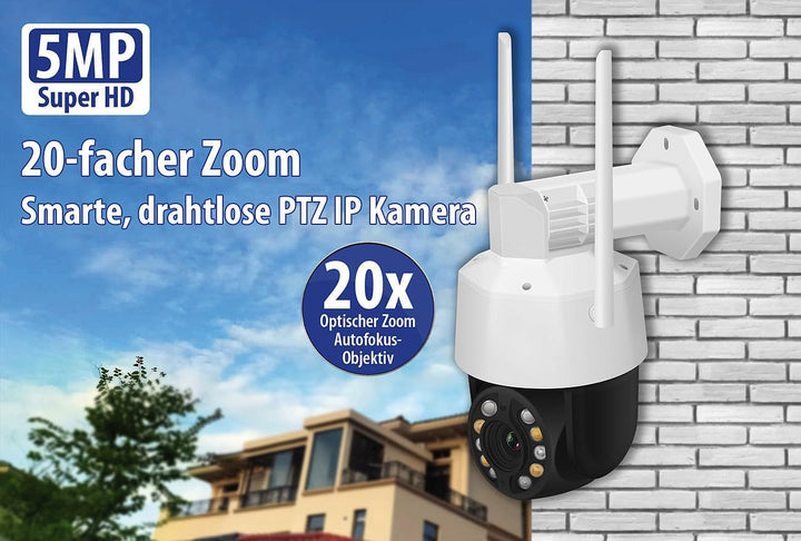 - 2 gerichtete Laser-IR-LEDs für Nachtsicht mit bis zu 100 m Reichweite • Extrahohe Auflösung in 2K+ (5 MP) mit 2560 x 1920 Pixeln • 20-fach optischer Zoom für bestes Bild auch beim Vergrössern • Riesiges 360°-Sichtfeld dank Pan-Tilt-Funktion