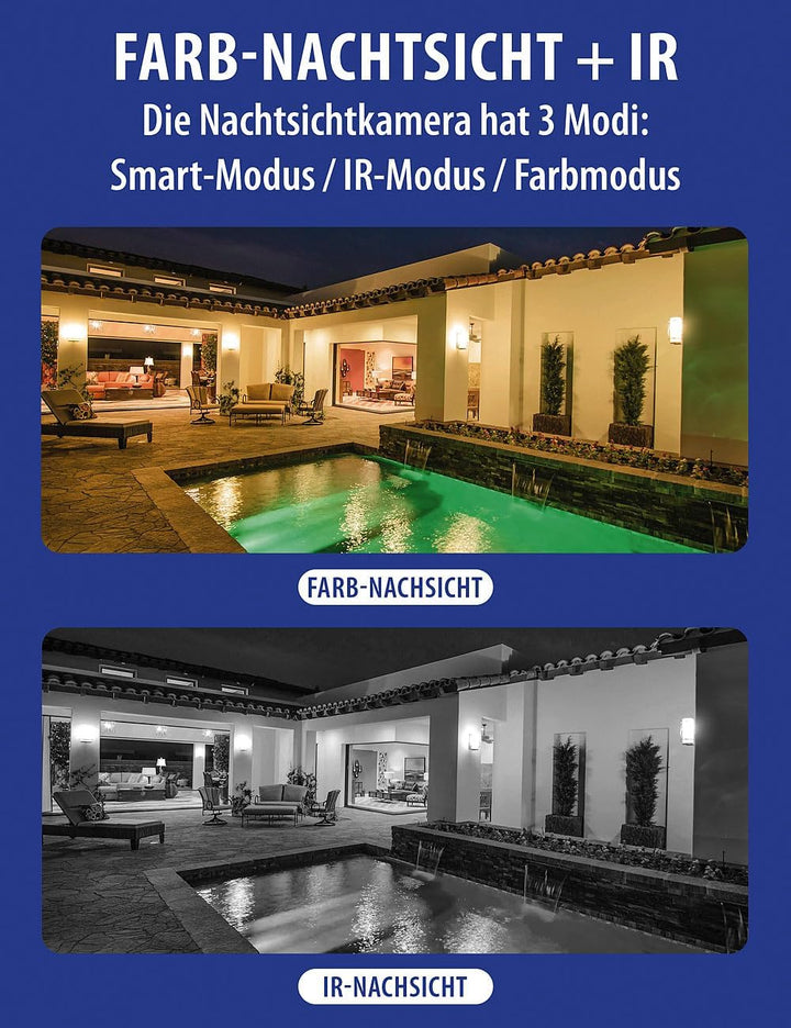 - Extra-hochauflösende Videos mit 2K+: 2560 x 1920 Pixel (5 MP) • Intelligente Personen-Erkennung: unterscheidet auf Wunsch zwischen Menschen und Gegenständen oder Tieren und verhindert so Fehlalarme • 4 Standard-IR-LEDs und 2 Laser-IR-LEDs (IR mit