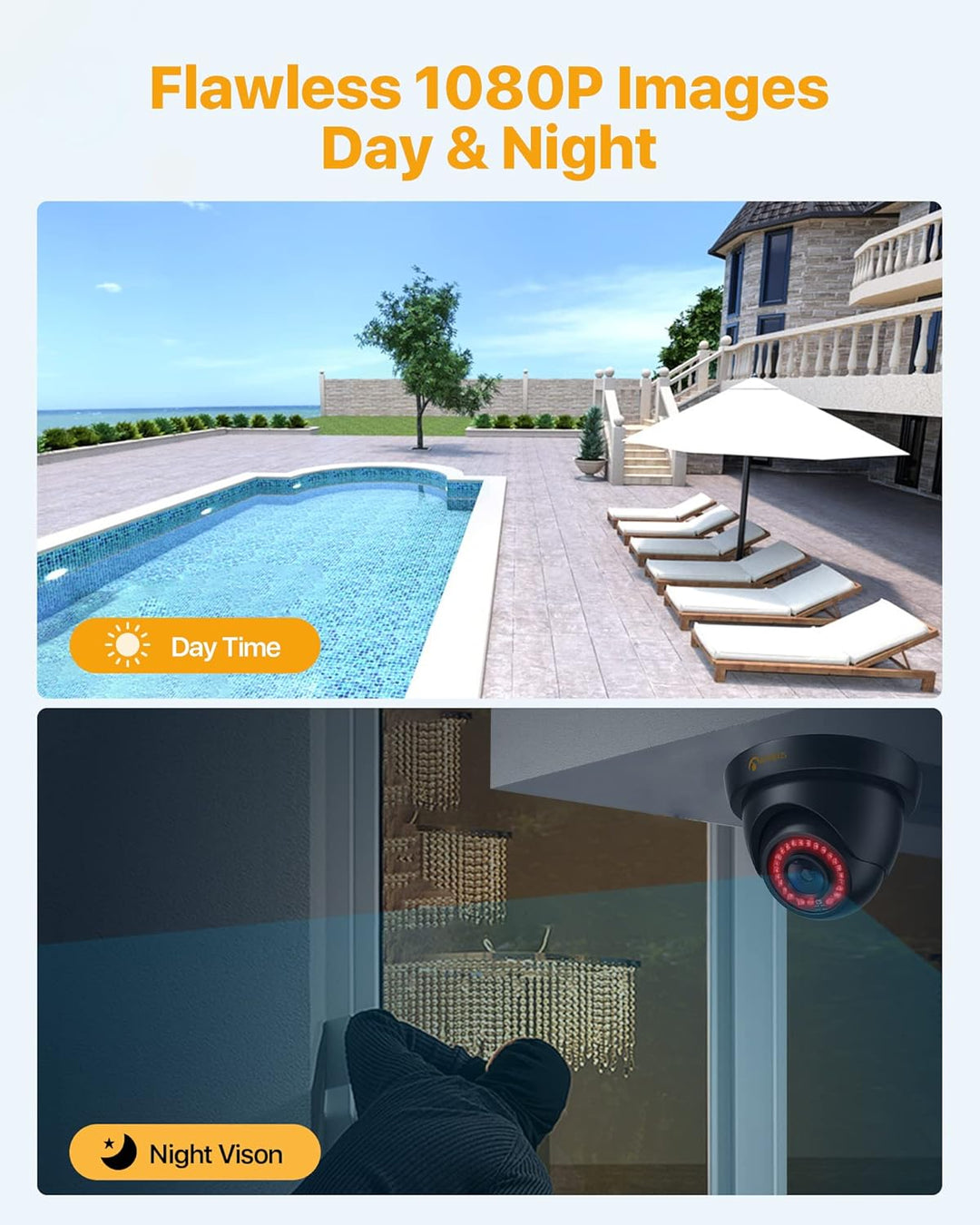 - 1080P Full HD & Nachtsicht: Der CMOS Sensor produziert scharfe Videos mit einer Auflösung von 2.0 MP und erfasst die Details, die Sie brauchen. Die 24 leistungsstarken LED-Lampen geben Infrarotbeleuchtung im Sichtfeld der Kamera ab und ermöglichen die