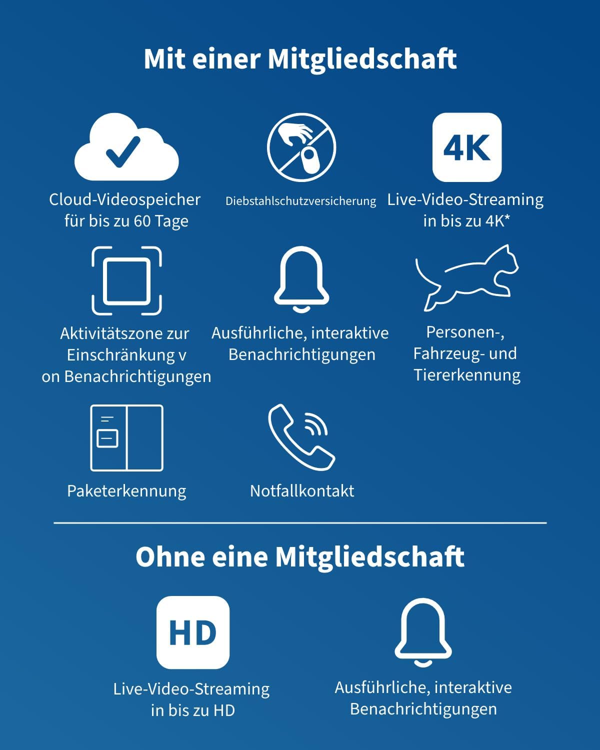 - ARLO SECURE MITGLIEDSCHAFT: Erhalten Sie KI-basierte Benachrichtigungen bei erkannten Bewegungen (Personen, Pakete, Tiere); individuelle Aktivitätszonen, Cloud-Speicherung sowie Schutz vor Kameradiebstahl – jederzeit kündbar