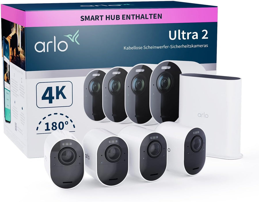 - ARLO SECURE SERVICEPLAN (separat erhältlich) sichert die Videos sicher in der Cloud. Erkennt mehr als jede andere Kamera; identifiziert und unterscheidet zwischen Personen, Autos, Haustieren und Paketen; ermöglicht Aktivitätszonen. Das Abonnement umfasst auch eine Versicherung zum Schutz vor Kameradiebstahl. 90 Tage Testversion enthalten