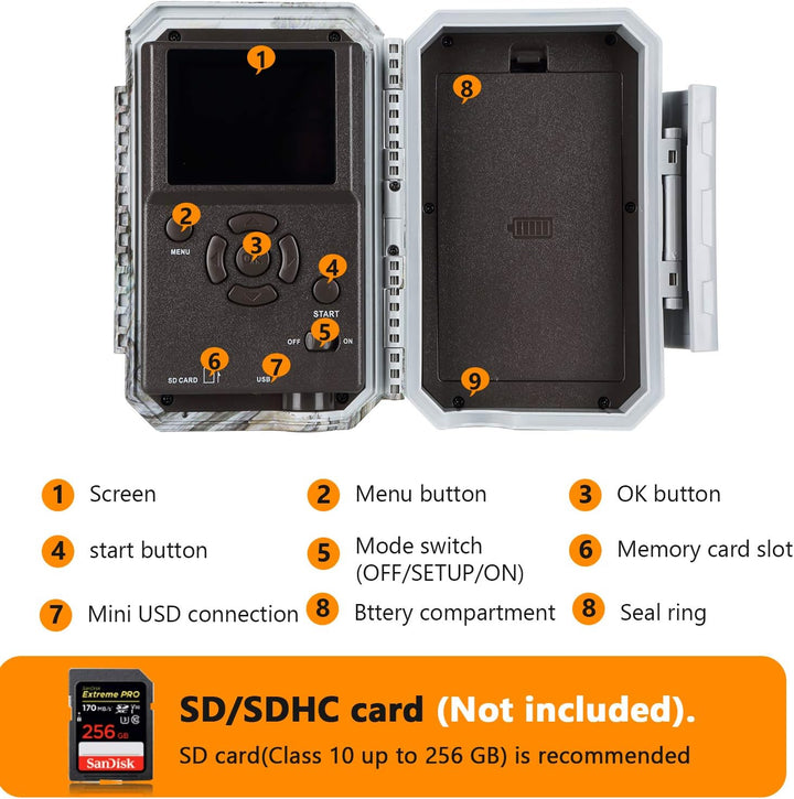 - 【Flexible Einstellungen und Unterstützung von 256 GB SD-Karte】3 Modi verfügbar (nur Foto, nur Video, Foto + Video), Schleifenaufzeichnung, Temperatur / Datum / Uhrzeit / Mondphasenabdruck, Seriennummer zur Identifizierung mehrerer Kameras,