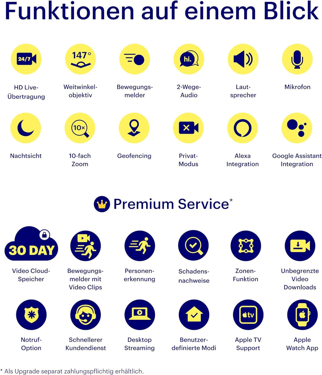 - ZUSÄTZLICHE FUNKTIONEN: 30 Tage Video-Cloud, Bewegungs- und Personenerkennung mit Videoclip, Zonen-Funktion, Unbegrenzte Video-Downloads, Notruf-Option und mehr mit dem Upgrade zum Premium Service
