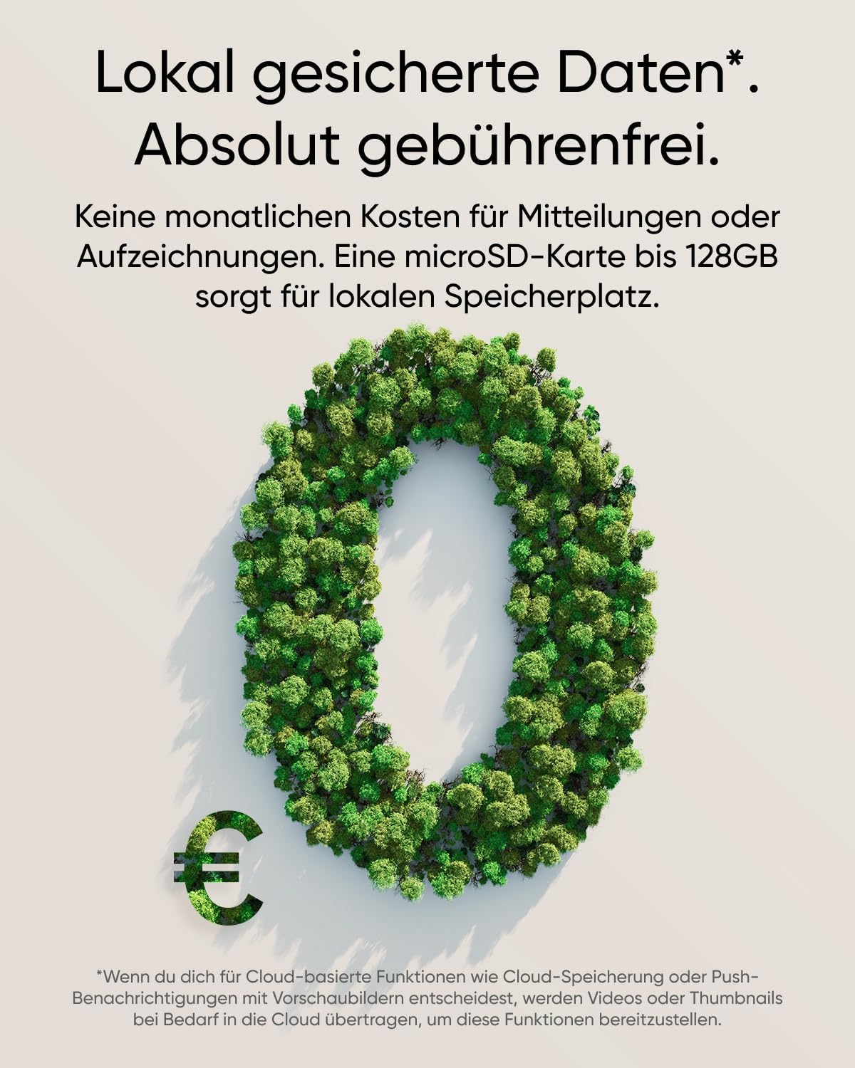 - Lokal gesicherte Daten: Absolut gebührenfrei: Keine monatlichen Kosten für Mitteilungen oder Aufzeichnungen. Eine microSD-Karte bis 128GB sorgt für lokalen Speicherplatz (nicht im Lieferumfang enthalten)