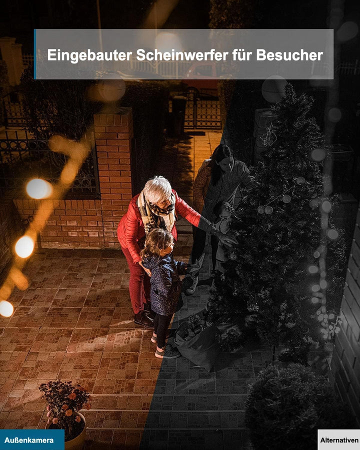 - INTEGRIERTER SCHEINWERFER: Ab jetzt spendet der eingebaute Scheinwerfer an der Sicherheitskamera nicht nur Licht, sondern gleichzeitig absolute Sicherheit - auch im Dunkeln.