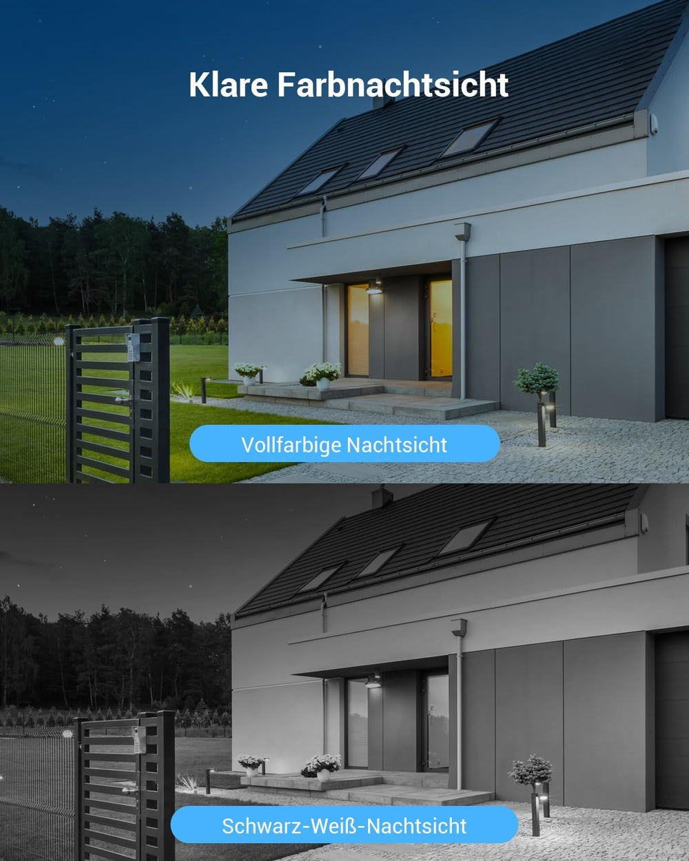 - 2K-Auflösung und Farbnachtsicht: Diese Kamera Überwachung Aussen zeichnet lebendige Bilder in ultraklarer 2K-Auflösung auf. Nachts beleuchtet diese WLAN Kamera die Umgebung mit einem eingebauten Scheinwerfer, um vollfarbige Bilder aufzunehmen.