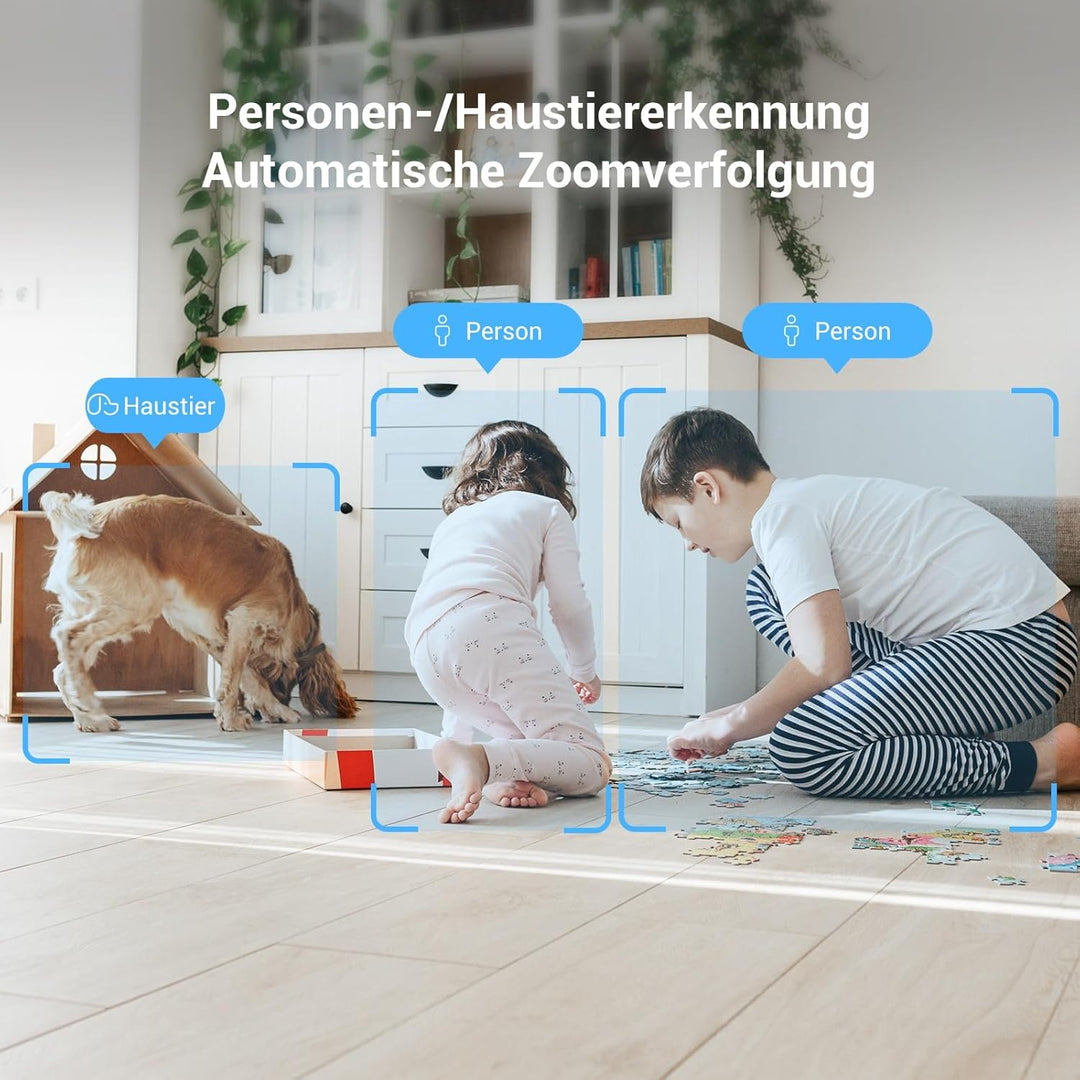 - Personen- und Haustiererkennung, intelligente Verfolgung: Sobald die Bewegung eines Haustiers oder einer Person erkannt wird, werden Sie eine Push-Nachricht erhalten. Die Innenkamera zoomt automatisch auf das erkannte Ziel heran, sodass Sie gleichzeitig