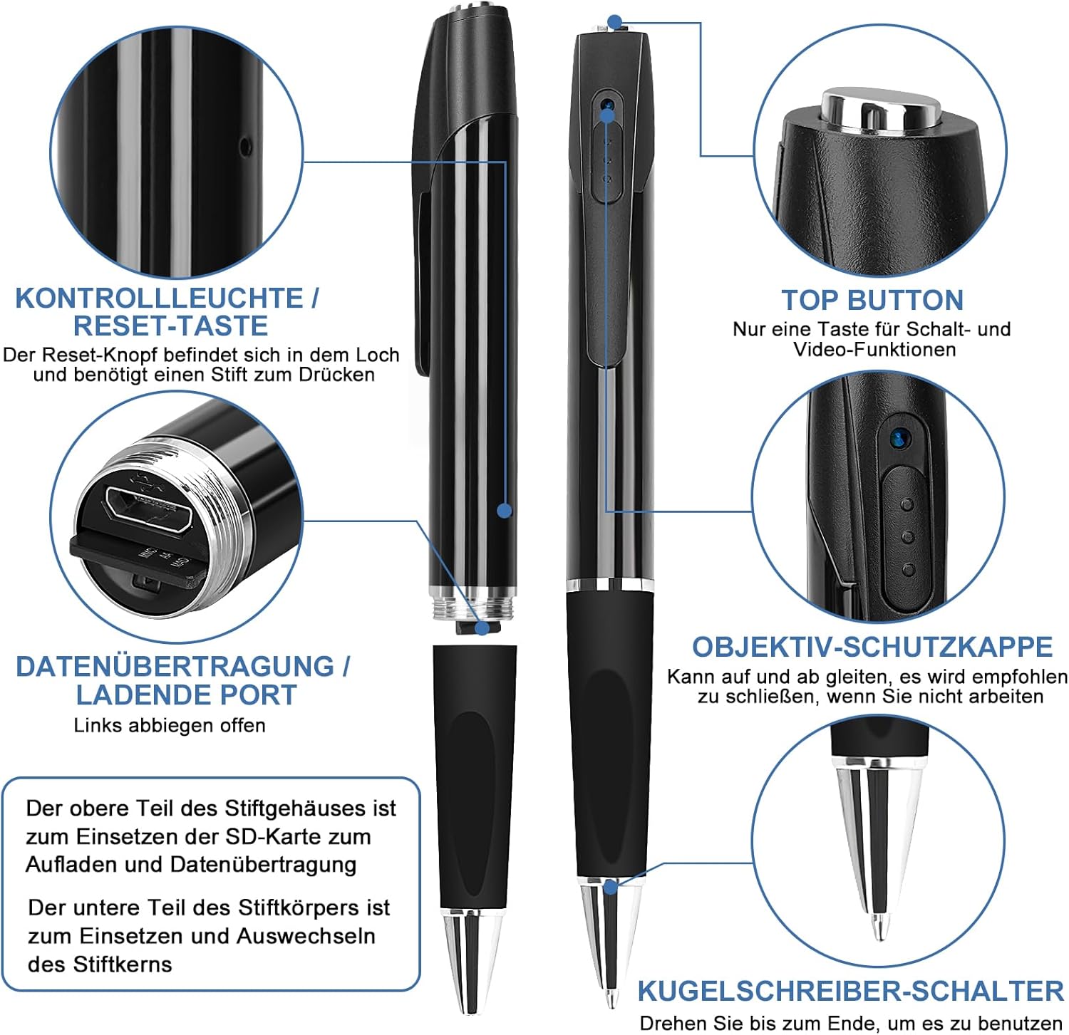 - [ Mini Stifte Kamera] Diese Mini-Kamera kann als gemeinsamer Schreibstift oder digitaler Mini-Kamera-Stift verwendet werden. Diese Mini kamera kann für Interviews, Meetings und Kurse verwendet werden. Es besteht keine Notwendigkeit, Software oder