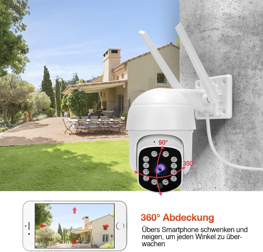 - A9 2023 gen SchwenkbarKamera, PT-Aussenkamera, 360°-Abdeckung: die überwachungskamera aussen A9 ist um 350° schwenkbar, um 90° neigbar, zusammen mit 130° Bildwinkel können Sie so 360° Ihres Gartens, des Eingangsbereichs oder der Garage im Auge