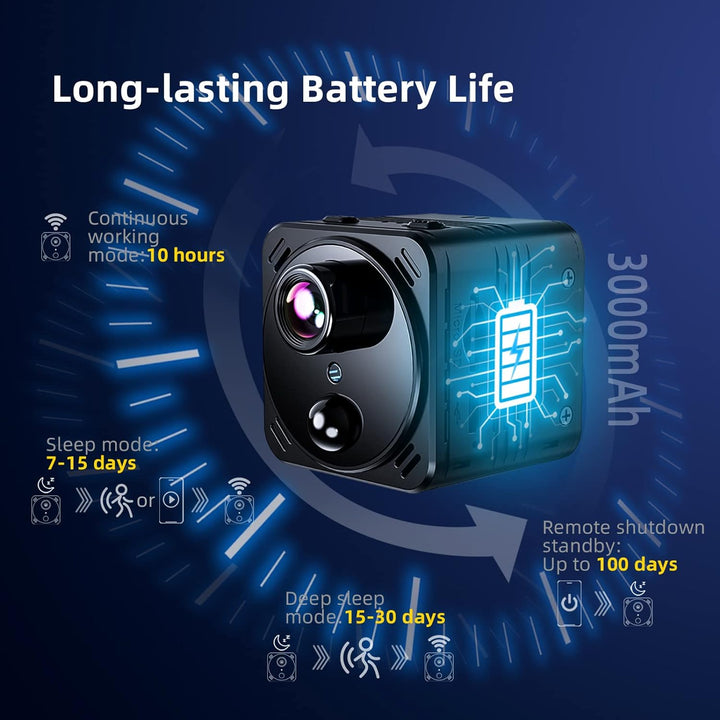 - Lange Akkulaufzeit: Diese Mini-WiFi-Überwachungskamera verfügt über einen integrierten, wiederaufladbaren 3000mAh-Akku und drei Arbeitsmodi für mehr Möglichkeiten. Akkulaufzeit als Referenz: Kontinuierlicher Arbeitsmodus (10 Stunden);