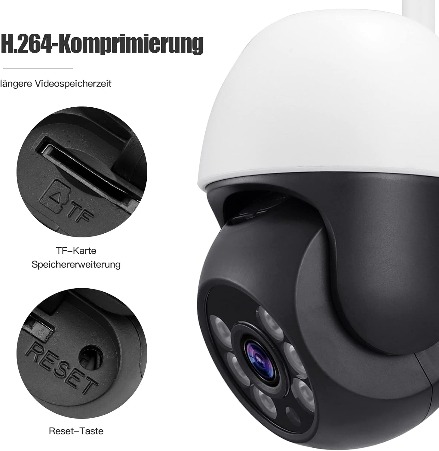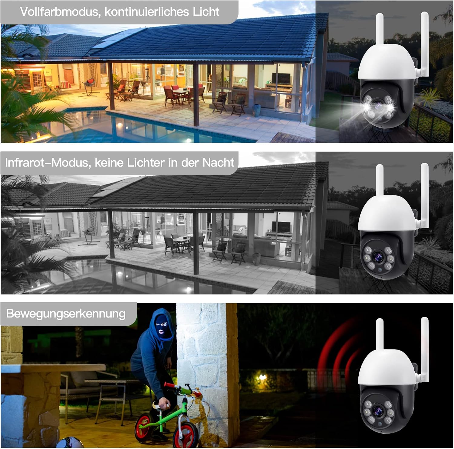 - 【HD & Weites Sichtfeld】 Die Aussenkamera nimmt 3MP Auflösung, 4 Infrarotleuchten und 2 LED-Leuchten sorgen dafür, dass Sie Tag und Nacht eine klare 2K-Bildqualität geniessen können. Die IP Kamera Outdoor deckt mehr Platz ab und reduziert tote