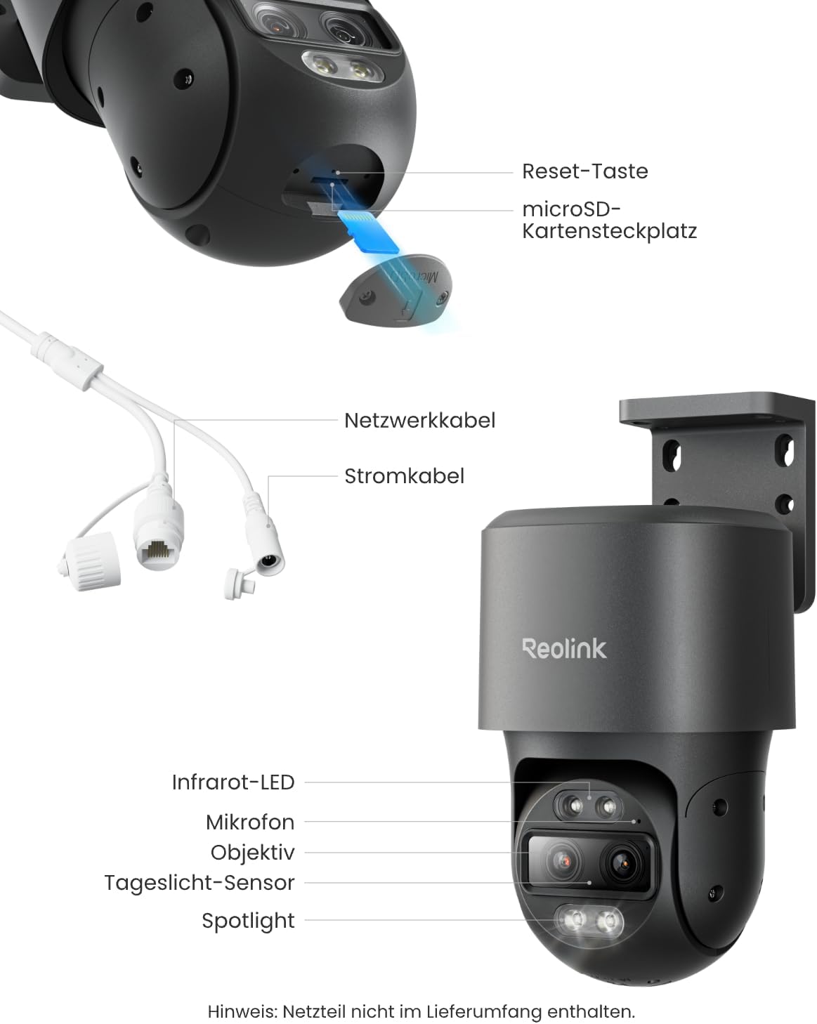 - Dual-Ansicht auf einem Screen: Sehen Sie genau, was in Ihrem Zuhause passiert – mit Dual-Ansicht auf einem Bildschirm. Das 8-mm-Teleobjektiv fängt Details in Nahaufnahme ein, während das 2,8-mm-Weitwinkelobjektiv einen Panoramablick ermöglicht.