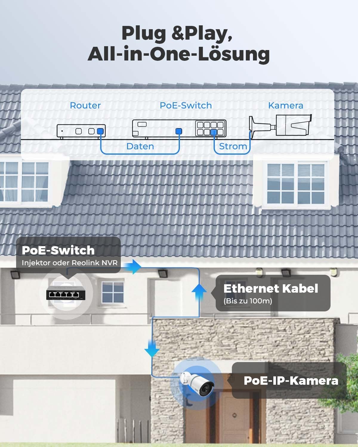 - Schnellere PoE-Installation: Diese CCTV Kamera verwendet ein einziges Ethernet-Kabel, um sowohl Daten als auch Strom zu übertragen. Vereinfachte Verkabelung bedeutet einfachere und sauberere Installation. Zuverlässige Plug-and-Play Verbindung für