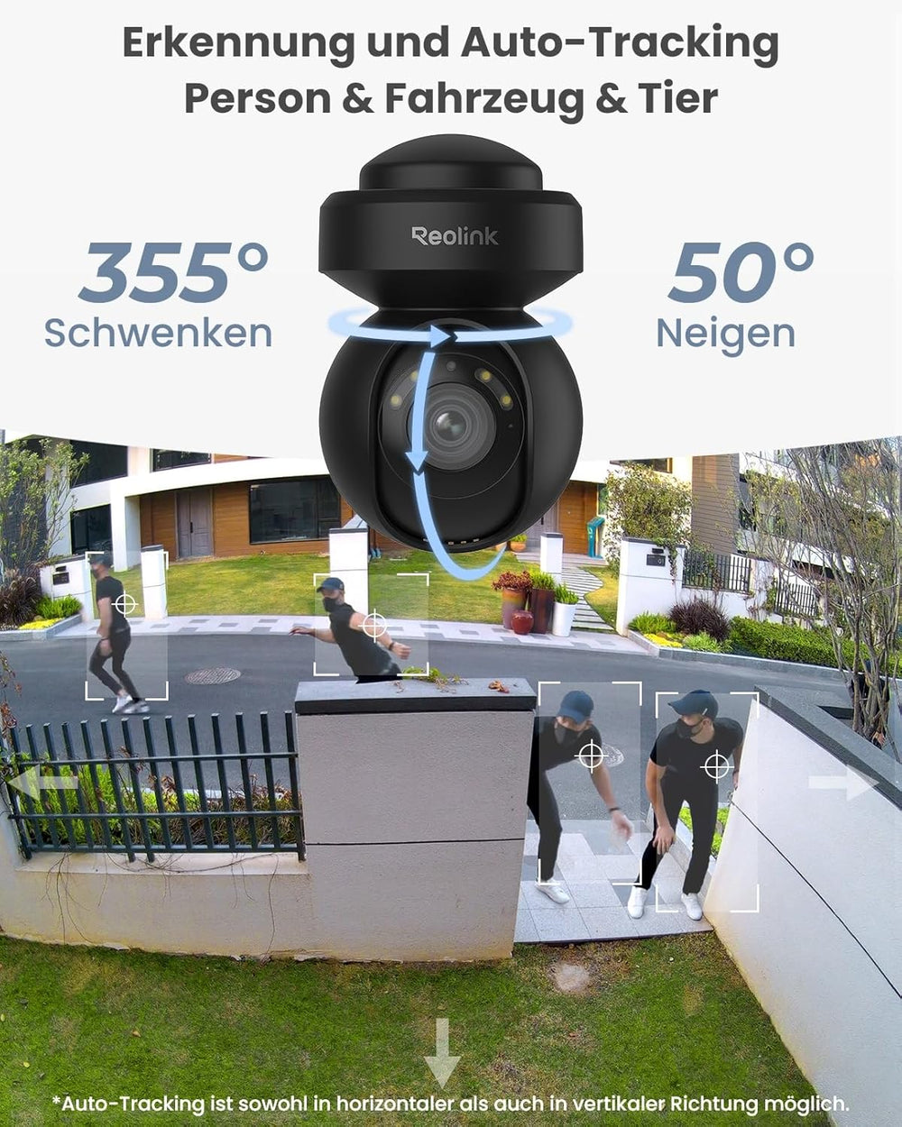 - Menschen-/Fahrzeugerkennung und Automatische Verfolgung: Mit der fortschrittlichen intelligenten Bewegungserkennung kann diese IP-Kamera Personen und Fahrzeuge von anderen Objekten unterscheiden. Sie können spezifischere Benachrichtigungen erhalten und