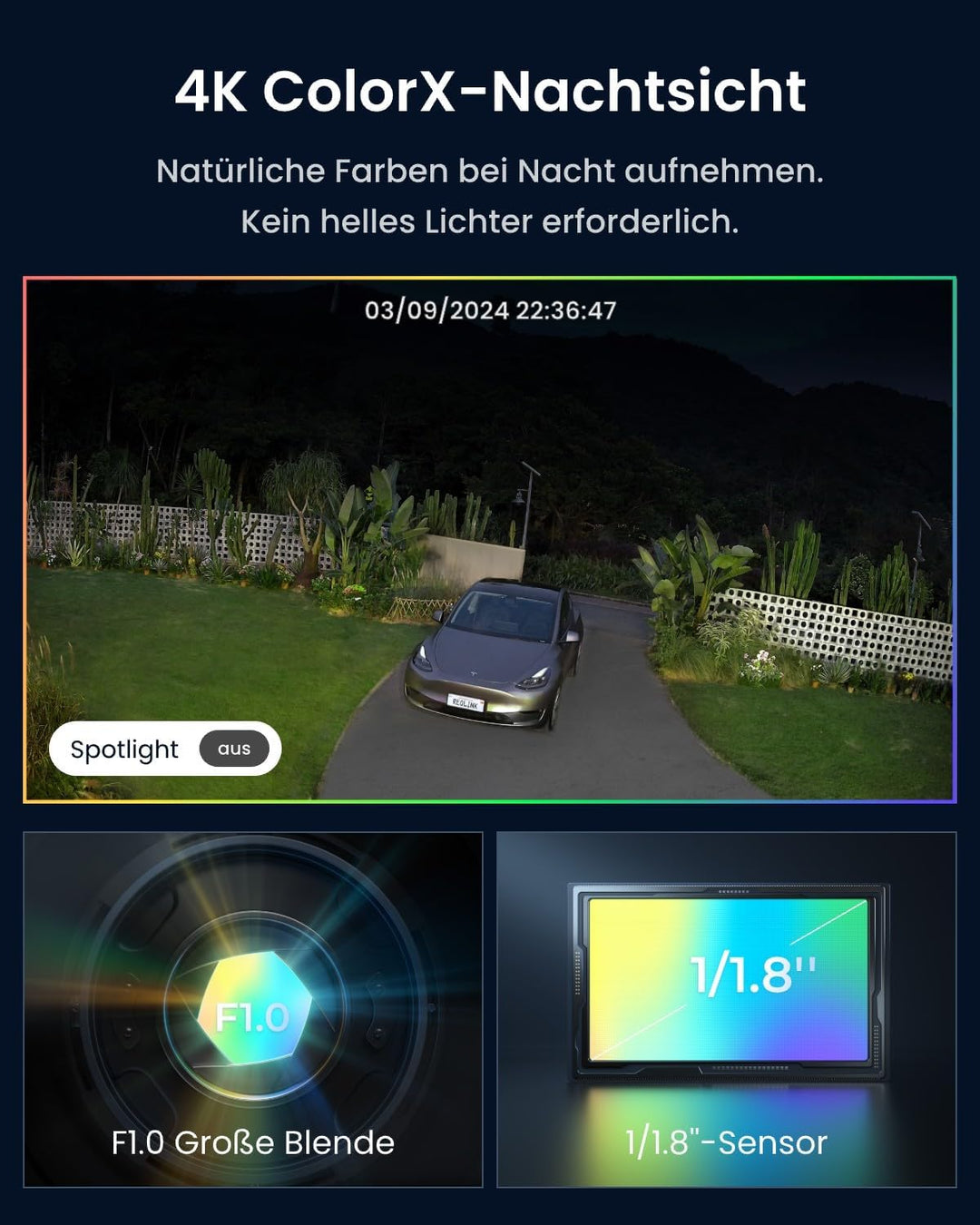 - 4K Solar Kamera mit ColorX-Nachtsicht: Dank der F1,0-Blende und dem 1/1,8"-Sensor erfasst diese Kamera 2X mehr Licht als Standardmodelle (F2,0 + 1/2,7"). Sie liefert ultrahochauflösende 4K-Nachtsicht in Farbe, ohne dass Spotlight oder Infrarotlicht