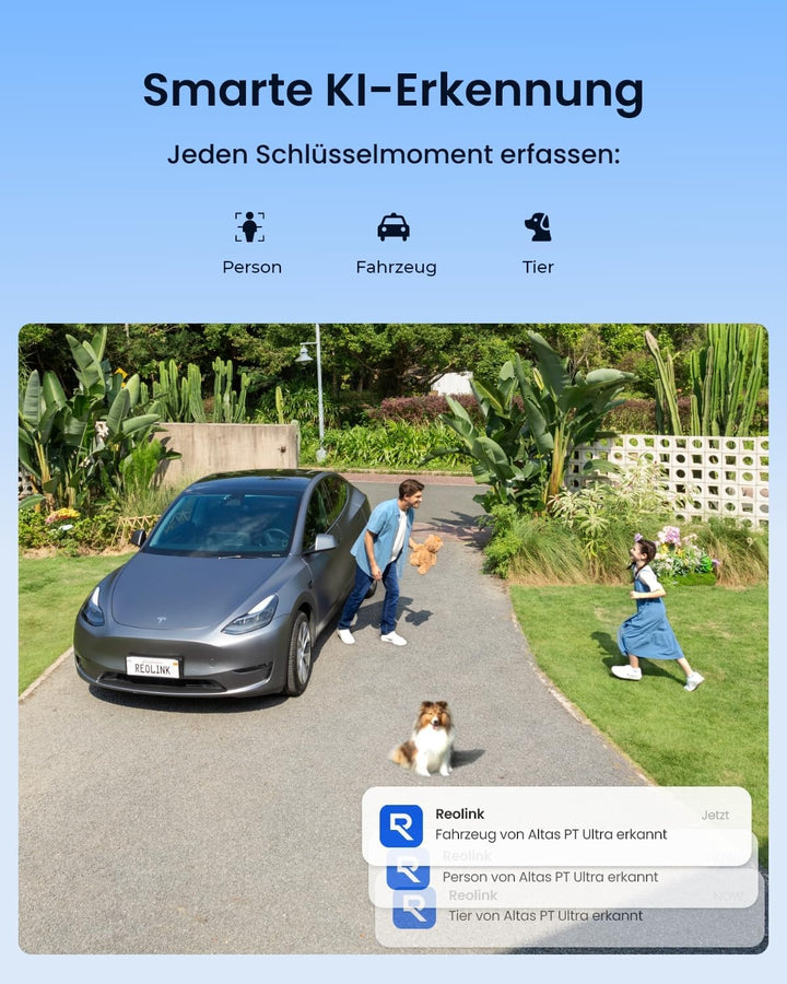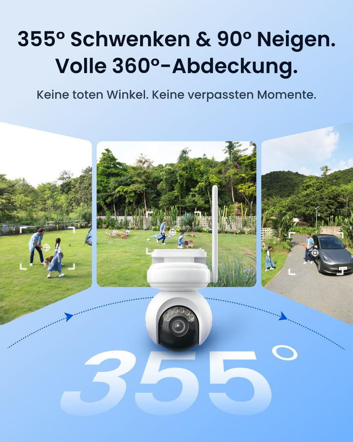 - Pan-Tilt + KI-Erkennung + Auto-Tracking: Mit einem 355° Schwenk- und 90° Neigungswinkel deckt diese Kamera jeden Winkel ab. Sie verfügt über KI-Erkennung für Personen, Autos und Tiere und verfolgt erkannte Ziele automatisch. So haben Sie bewegte