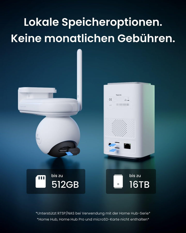 - Mehrere Speicheroptionen: Unterstützt microSD-Karte bis zu 512GB (nicht enthalten) sowie Home Hub/Home Hub Pro (bis zu 16TB, nicht enthalten). In Kombination mit dem Hub ist zudem RTSP/NAS möglich. All das ohne monatliche Gebühren und Sie haben volle