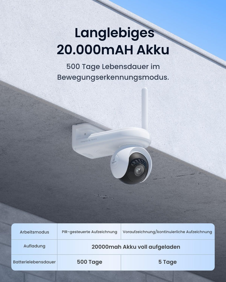- 4K-Akku-Kamera mit Daueraufzeichnung: Erleben Sie ultra-hochauflösende 4K-Aufnahmen mit anpassbaren Modi und Plänen. Diese kabellose Akku-PT-Kamera bietet Daueraufzeichnung, Voraufzeichnung und PIR-ausgelöste Aufzeichnung, wodurch falsche und