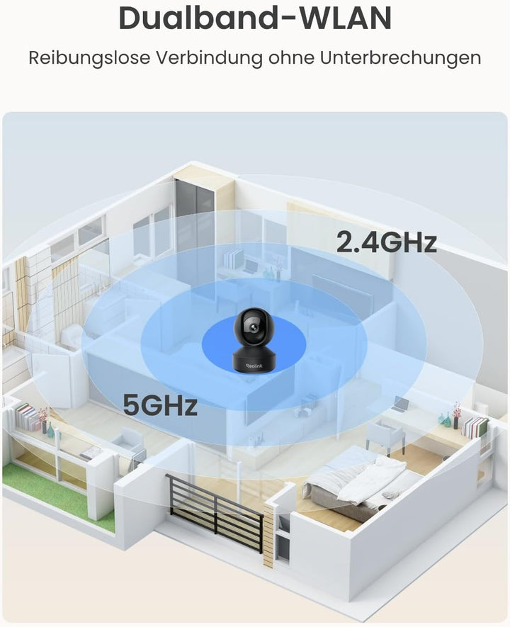 - Dualband-WLAN-Verbindung: Mit integrierten 2T2R-MIMO-Antennen und Dualband-Technologie unterstützt diese IP-Kamera sowohl 2,4GHz als auch 5GHz WLAN und funktioniert stabiler mit dem Router. Kein Signalverlust od. Interferenzen