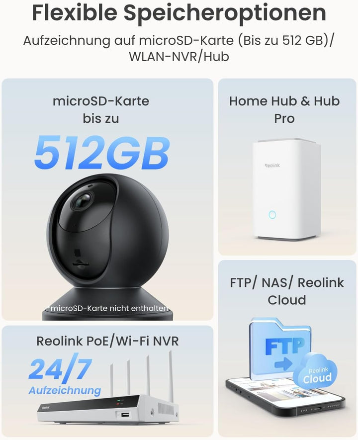 - Flexible Aufnahmeoptionen: Diese Kamera unterstützt 24/7 kontinuierliche, bewegungsausgelöste und geplante Aufnahmen. Videos aller dieser 3 Aufnahmearten können auf der microSD-Karte(bis 128GB, nicht inkl.) od. Reolink NVR gespeichert werden.