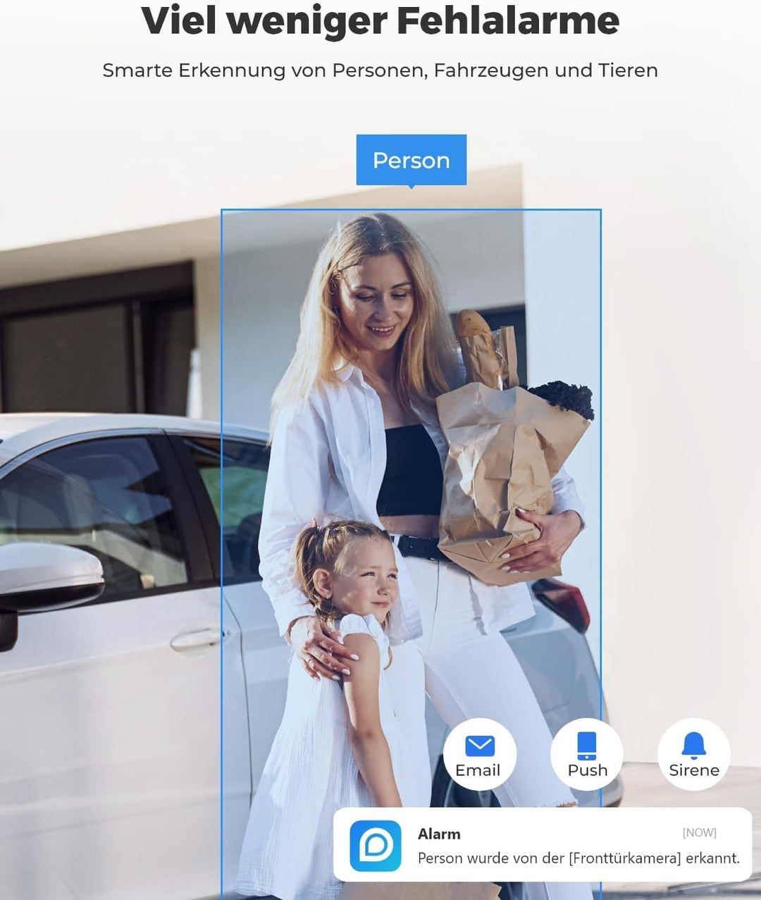 - SMARTE ERKENNUNG & SOFORTIGE ALARME: Dank der fortschrittlichen KI-Technologie kann diese WLAN Aussenkamera Personen und Fahrzeuge von anderen Objekten unterscheiden. Sie können spezifischere Benachrichtigungen erhalten und mit nur einem Blick auf den Bildschirm Ihres Handys sofort wissen, was Alarme auslöst