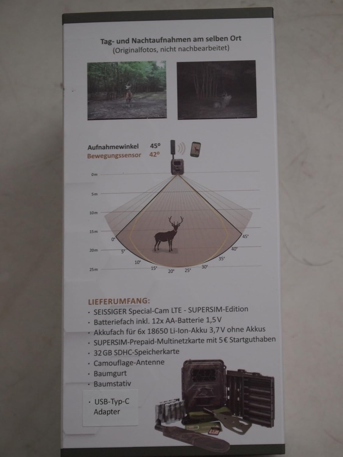- Das Komplettpaket enthält alles, was Sie für den sofortigen Einsatz benötigen: SEISSIGER Special-Cam LTE SUPERSIM-Edition, Wechselmagazin-Kassette inkl. 6x 18650 Li-Ion-Akku 3,7V, , SUPERSIM-Prepaid-Multinetzkarte mit 5€ Startguthaben, 32GB