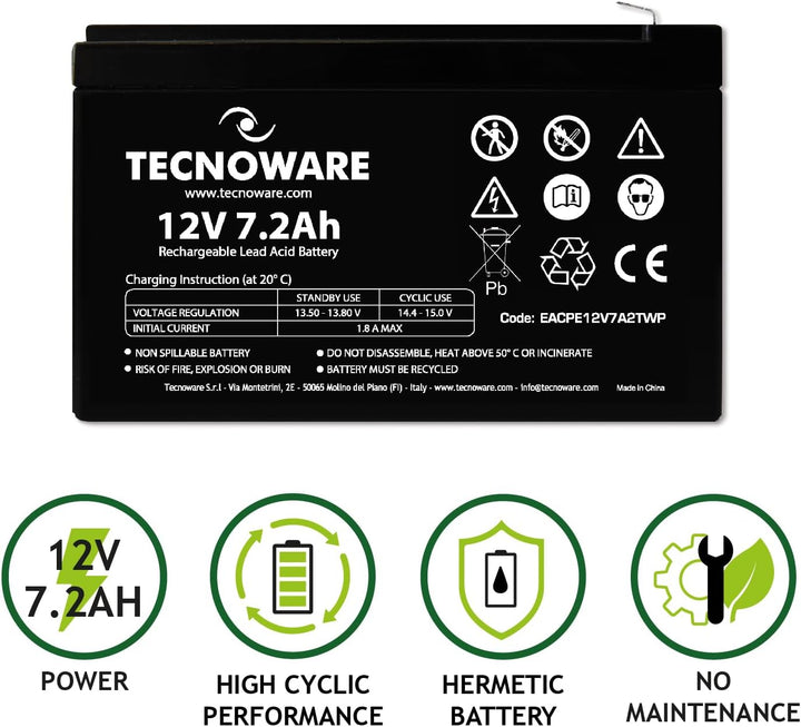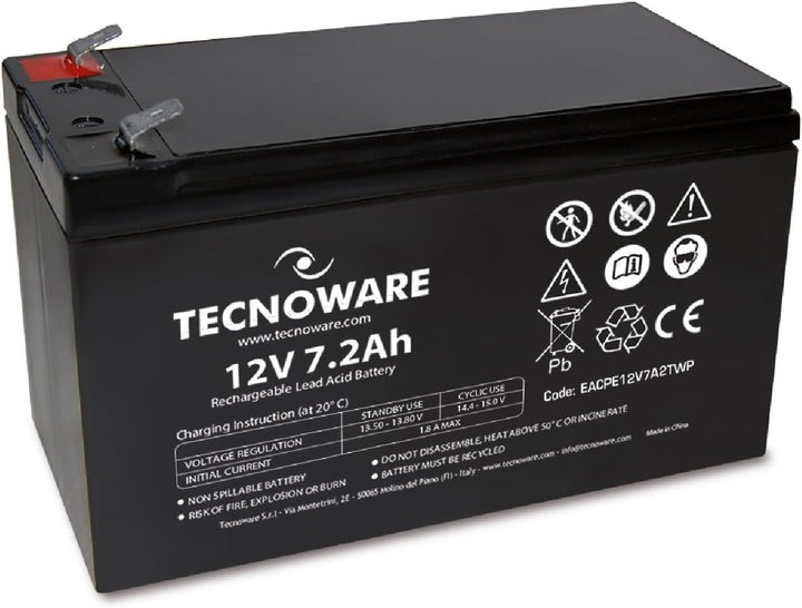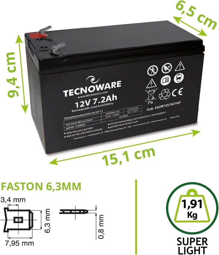 - Hermetische Bleibatterie. Spannung 12 V und Kapazität 7,2 Ah.