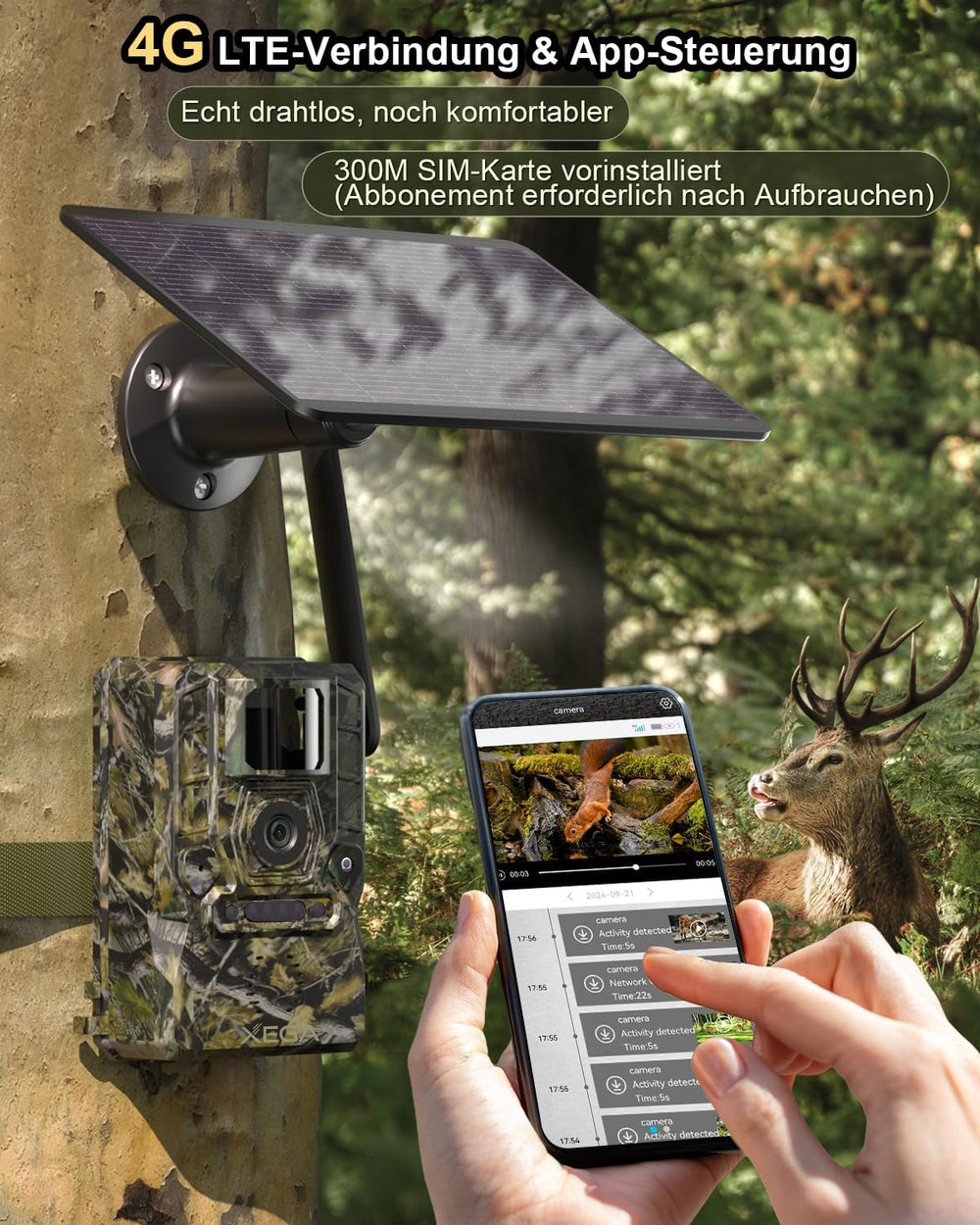 - 【2K Live-Video & APP Fernbedienung】Die wildkamera mit sim karte ist mit 2K HD-Bildern ausgestattet und Kann Echtzeit-Videos und Fotos von Wildtieren aufnehmen. Die Sie über die UCon-App abrufen können.Zudem können Sie die solar wildkamera
