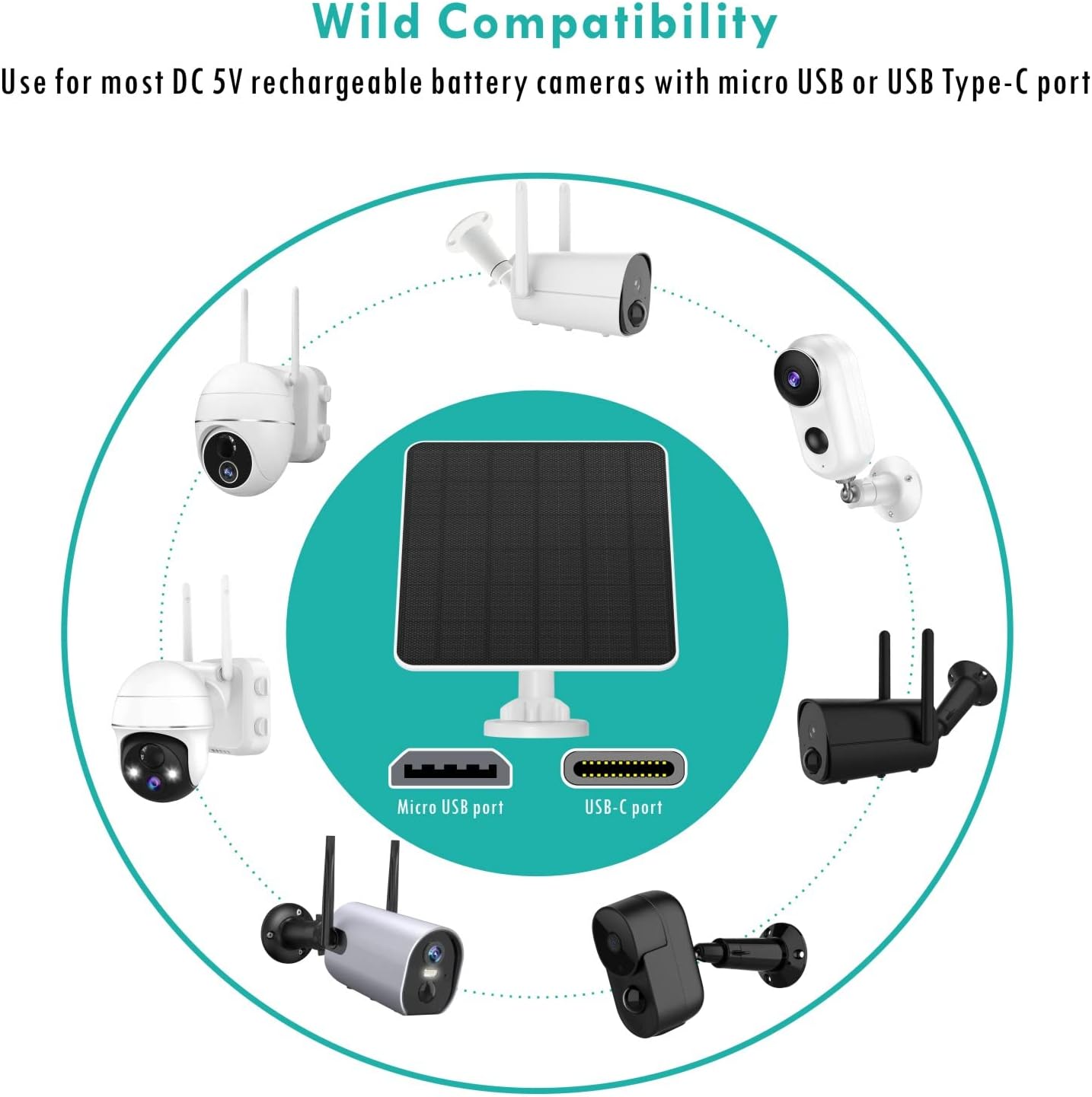 - Kompatibilität: 6W Solarpanel ist kompatibel mit DC 5V Akku-Kameras mit Micro-USB- oder USB Typ-C-Anschluss. Das Solarpanel ist nicht kompatibel mit Arlo, Blink, Ring, Google Nest, Kasa Kameras und anderen Plug-in-Kameras ohne Batterie.