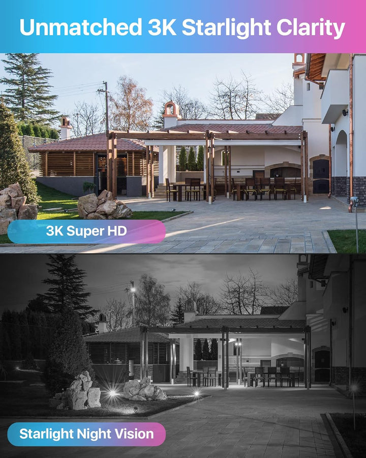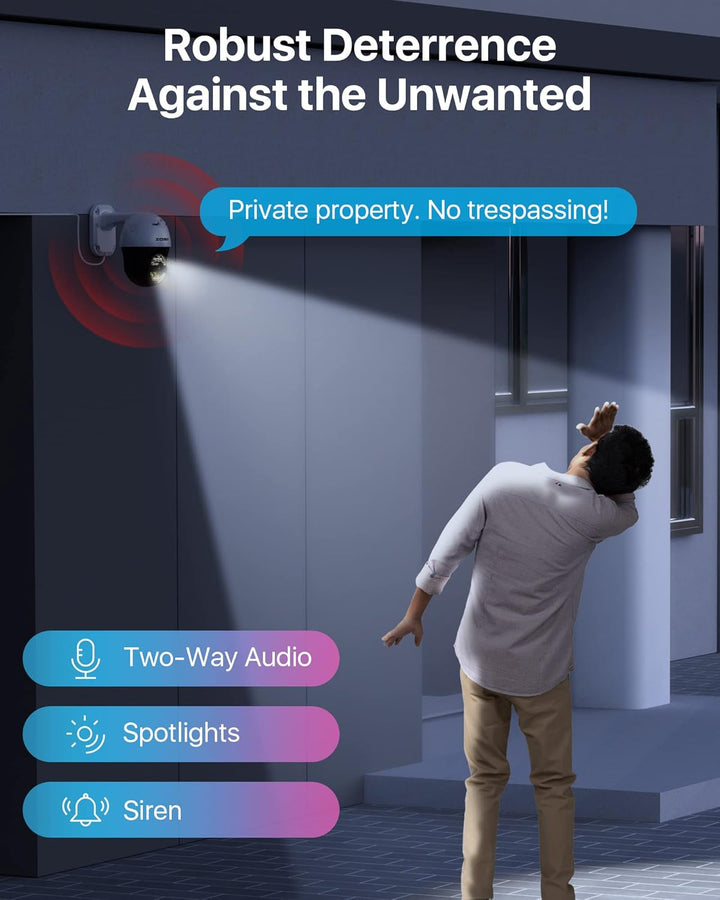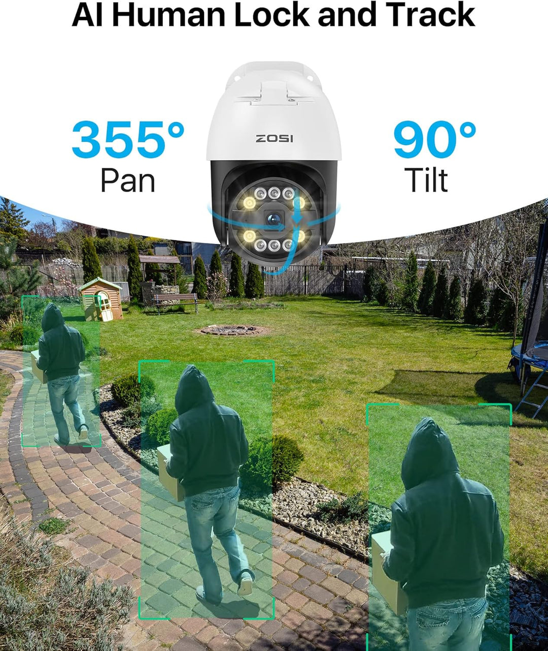 - KI Erkennung und Bewegungsalarm in Echtzeit: Dank fortschrittlicher KI-Technologie werden Personen, Autos, Haustiere und Pakete genau erkannt und Fehlalarme reduziert. Bei verdächtigen Bewegungen löst die Sicherheitskamera automatisch Ton- und