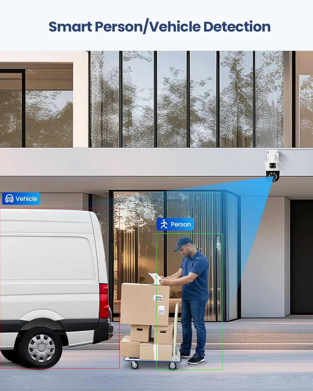 - 𝗞𝗜 𝗘𝗿𝗸𝗲𝗻𝗻𝘂𝗻𝗴 𝘂𝗻𝗱 𝗣𝗲𝗿𝘀𝗼𝗻𝗲𝗻𝘃𝗲𝗿𝗳𝗼𝗹𝗴𝘂𝗻𝗴: Dank KI-Algorithmen unterscheidet diese PT-Kamera zuverlässig zwischen Menschen und Fahrzeugen. Sobald eine Person den