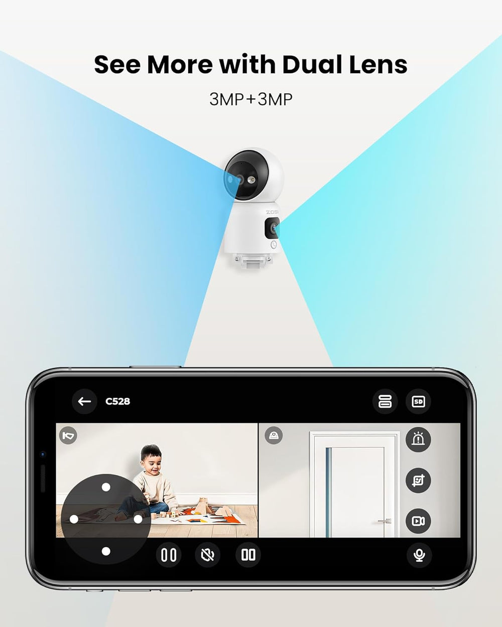 - 𝗗𝗼𝗽𝗽𝗲𝗹𝗼𝗯𝗷𝗲𝗸𝘁𝗶𝘃: Innovative WLAN Überwachungskamera mit Dual-Objektiv. Obere Linse rotiert horizontal 360° und vertikal 108°, während untere Linse ein Panoramabild anbietet. Mit dieser WLAN Innenkamera können