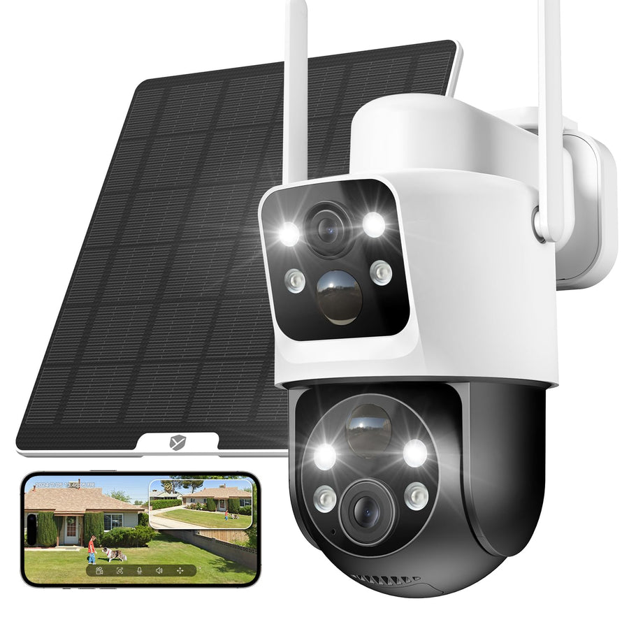 YESKANO 2K Überwachungskamera Aussen Solar, 360° PTZ Solar Kamera Outdoor mit Dual Objektiv, Kabello