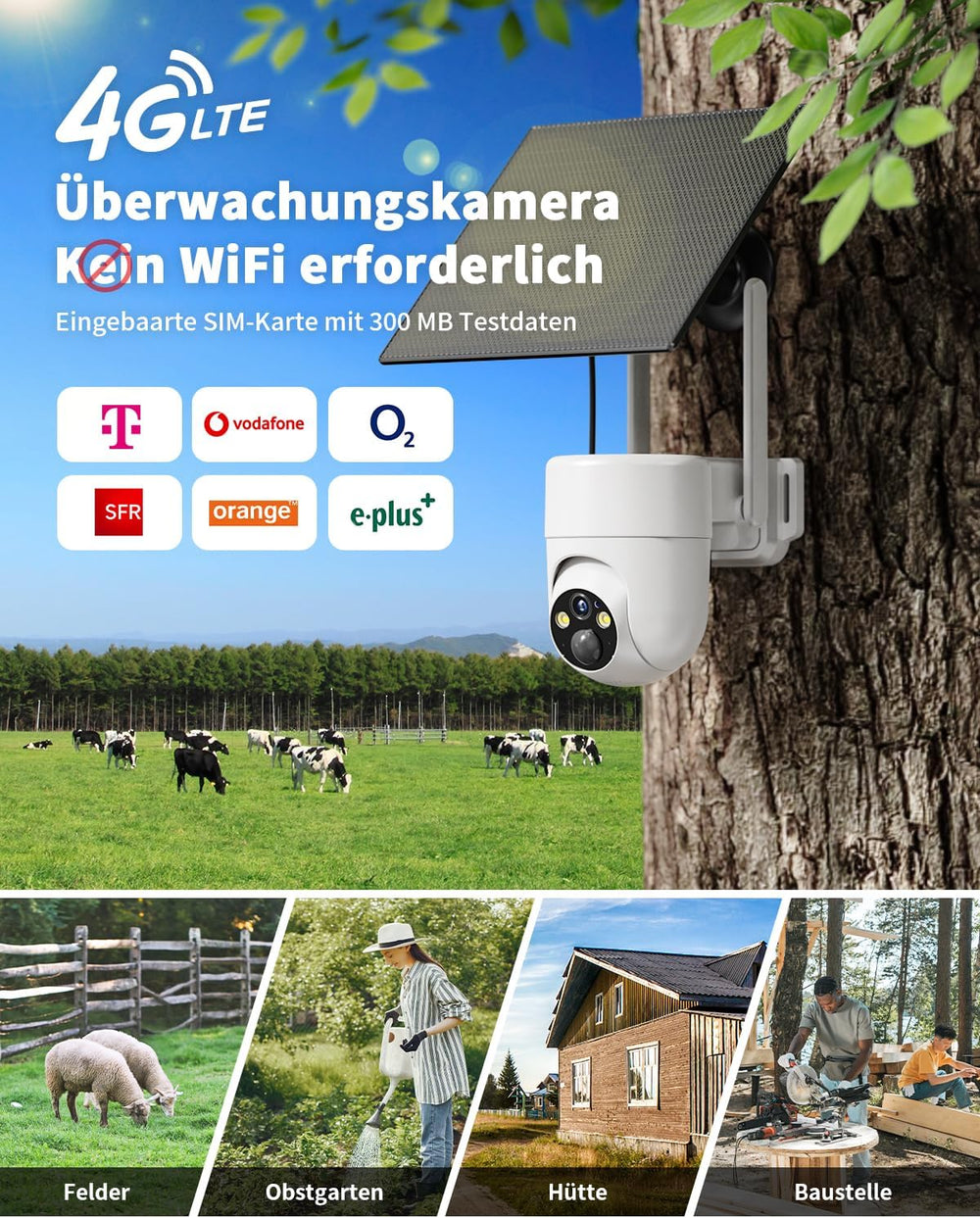 SEHMUA 3G/4G LTE Überwachungskamera Aussen mit SIM Karte, Solar IP Kamera ohne WLAN mit präziser Per