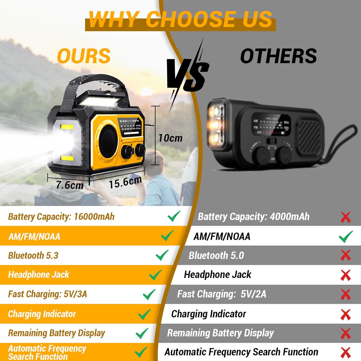 - [2024 Verbessert 16000mAh/59200mWh Kurbelradio] Unser neuestes modell verfügt über die grösste akkukapazität auf dem Markt - beeindruckende 16000 mAh, kann nicht nur das solar radio mit strom versorgen, sondern im Notfall auch Ihre mobilen Geräte