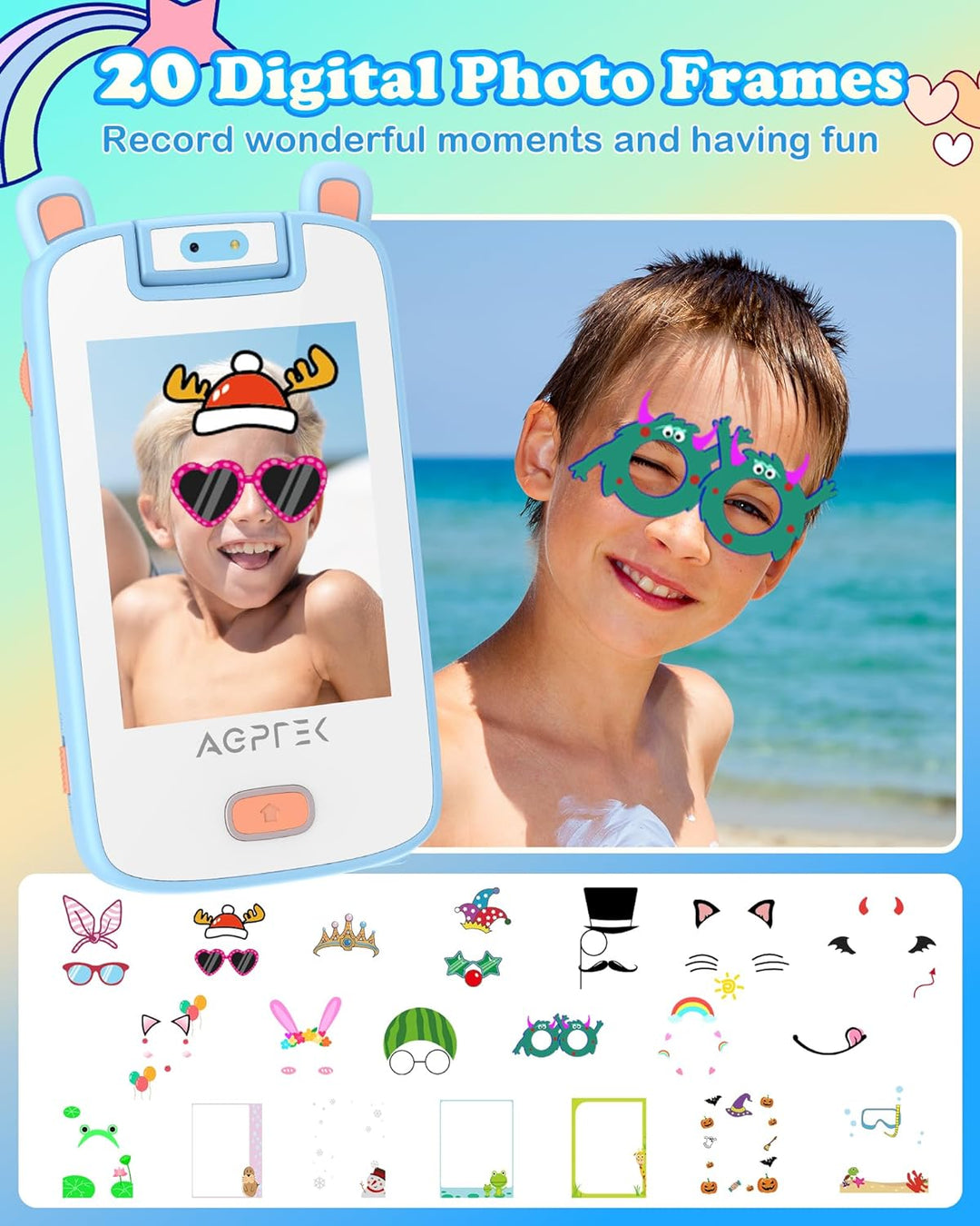 - 🐶【180° drehbare Kamera 12 Spiele】Die Kamera kann durch Verschieben der Seiten einfach gedreht werden. Einfaches Aufnehmen von Fotos und Selfies. Kinder können wertvolle Momente und Videos festhalten. Es sind 20 niedliche Aufkleber integriert,
