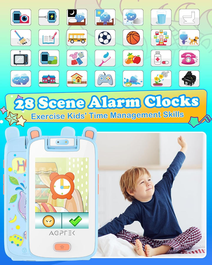 - ⏰【Multifunktional】 Rüsten Sie das Gaming-Telefon für Kinder mit mehr Funktionen auf. Inklusive Fotoaufnahme, Videoaufzeichnung, Audiorecorder, Wiedergabe, Multifunktionswecker, Geschichtenbuch, 26 Briefen und Allgemeinwissenskarten (10 Länder,
