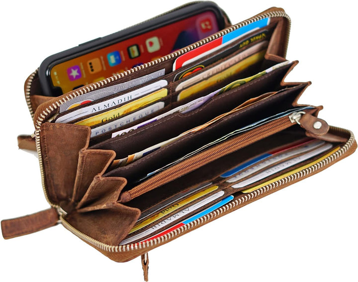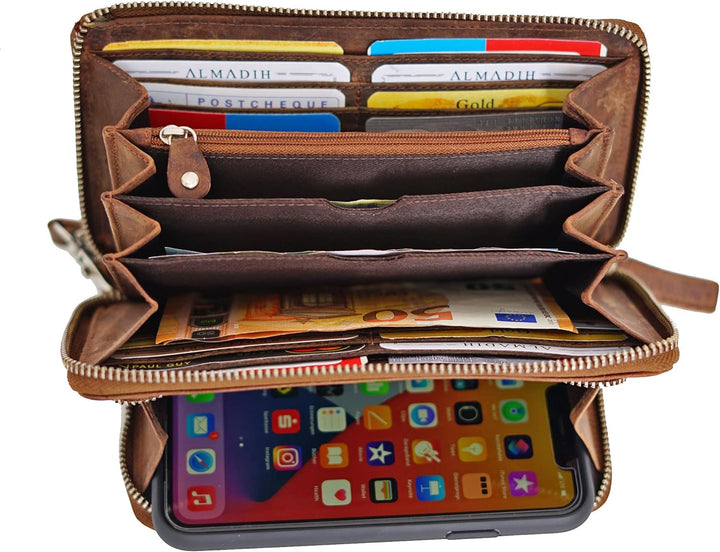 - ✔ Aufteilung: 1 Handyfach mit Reissverschluss (ca. 15x7 cm) - 12 Kartenfächer - 4 Geldscheinfächer - 2 Einsteckfächer - 2 Kleingeldfächer mit Reissverschluss - 1 Handgelenkschlaufe (Lieferung ohne abgebildetes Zubehör)