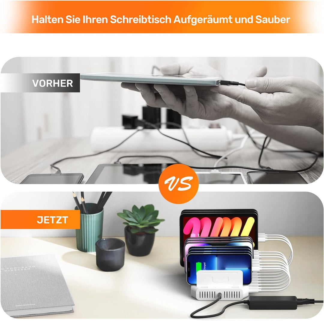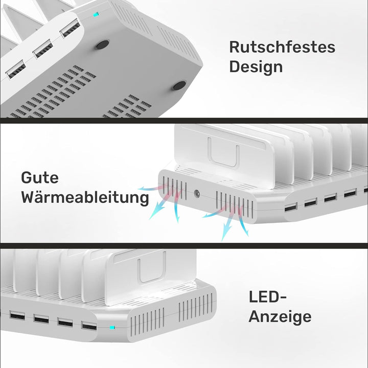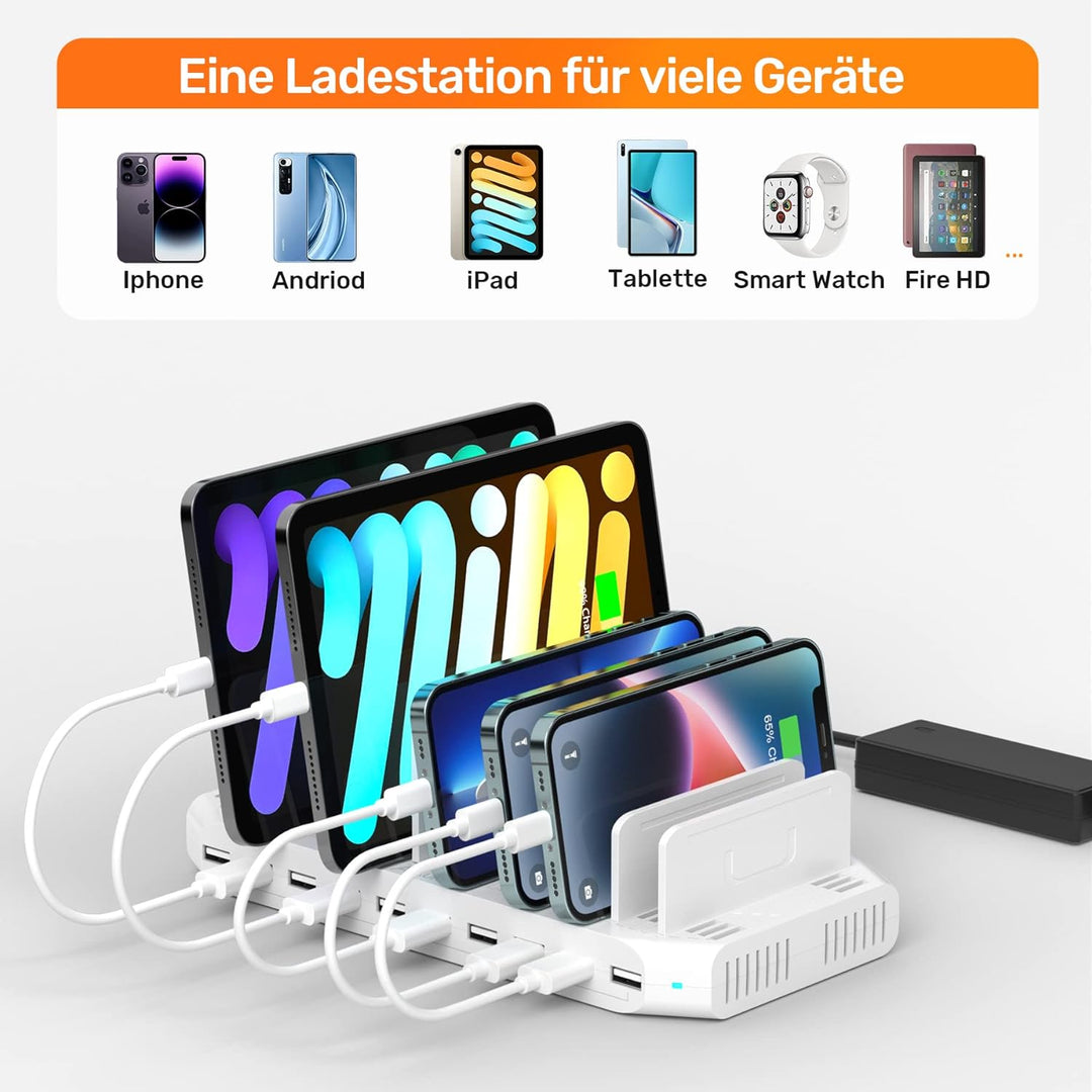 - 【PROPER AND ORGANIZED】Die kompakte und leichte Tablet Ladestation kann alle Ihre Geräte überall aufladen und Kabelsalat vermeiden. Halten Sie Ihren Schreibtisch sauber und aufgeräumt.