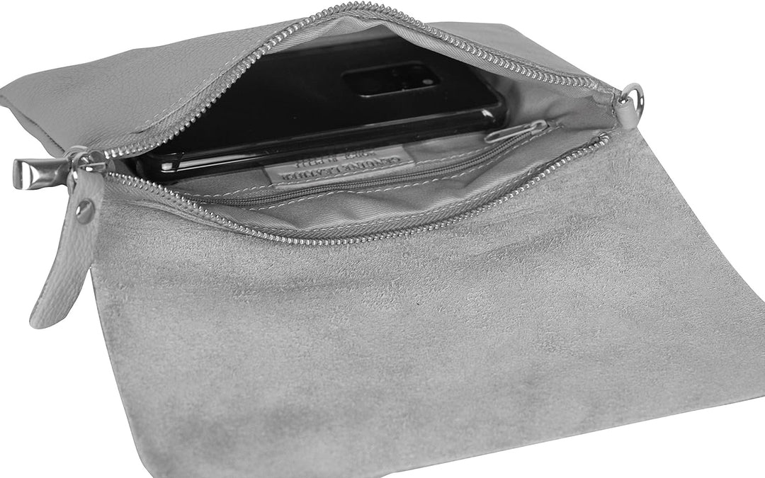 PRODUKTBESCHREIBUNGEN Italienische handgefertigte Damen Umhängetasche, Clutch, Handytasche aus weichem, strapazierfähigem Leder. Praktisch für unterwegs, wenn Sie keine grosse Handtasche dabei haben möchten, können Sie in dieser kleinen, schönen Tasche ganz einfach Ihr Smartphone, Ihre Schlüssel und kleine Gegenstände aufbewahren. Robustes echtes Leder - ein Hauptfach mit Reissverschluss - mit einer Überschlag für zusätzliche Sicherheit - Innenmatrial Stoff - innen eine seitliche Tasche mit Reissverschluss - silberfarbene Metallteile - abnehmbarer Schultergurt. Aussenmasse (leer): ca. Länge 24 cm x Höhe 14 cm x Breite 2 cm. Schultergurt verstellbar ab ca. 60 - 120 cm. Ungefähres Gewicht. 0,2 kg. Ambramoda ist eine eingetragene Marke. Die Farbe kann aufgrund unterschiedlicher Anzeigen und Farbauflösungen oder Monitoreinstellungen von der Bildfarbe abweichen. Eine korrekte und genaue Darstellung der Farben ist über das Internet nicht möglich.