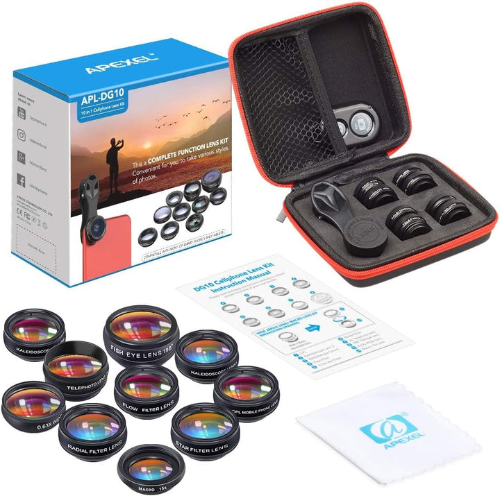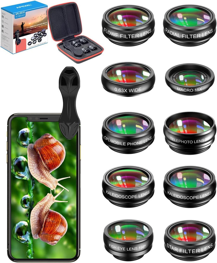 - ☛11-in-1-Objektiv-Kit☚ Das CPL-Objektiv, Kaleidoskop-Objektiv 3, Kaleidoskop-Objektiv 6, Flow-Filter-Objektiv, Radial-Filter-Objektiv, 4-Linien-Stern-Filter-Objektiv, 198 ° Fisheye-Objektiv, 0,63x Weitwinkel-Objektiv, 15x Marco Objektiv, 2x