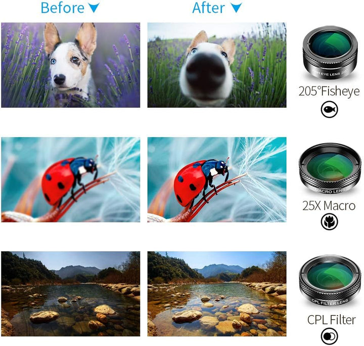 - WIE VIELE LINSEN ENTHALTEN? Das 6 in 1 Handy-Kamera-Objektiv-Kit ist Spass, COMPACT und hat alles. Dieses Objektiv-Kit hat alles, was Sie brauchen. Das 205-Grad-Fischaugenobjektiv, 120-Grad-Weitwinkelobjektiv und 25-fach-Makroobjektiv, Stern- und