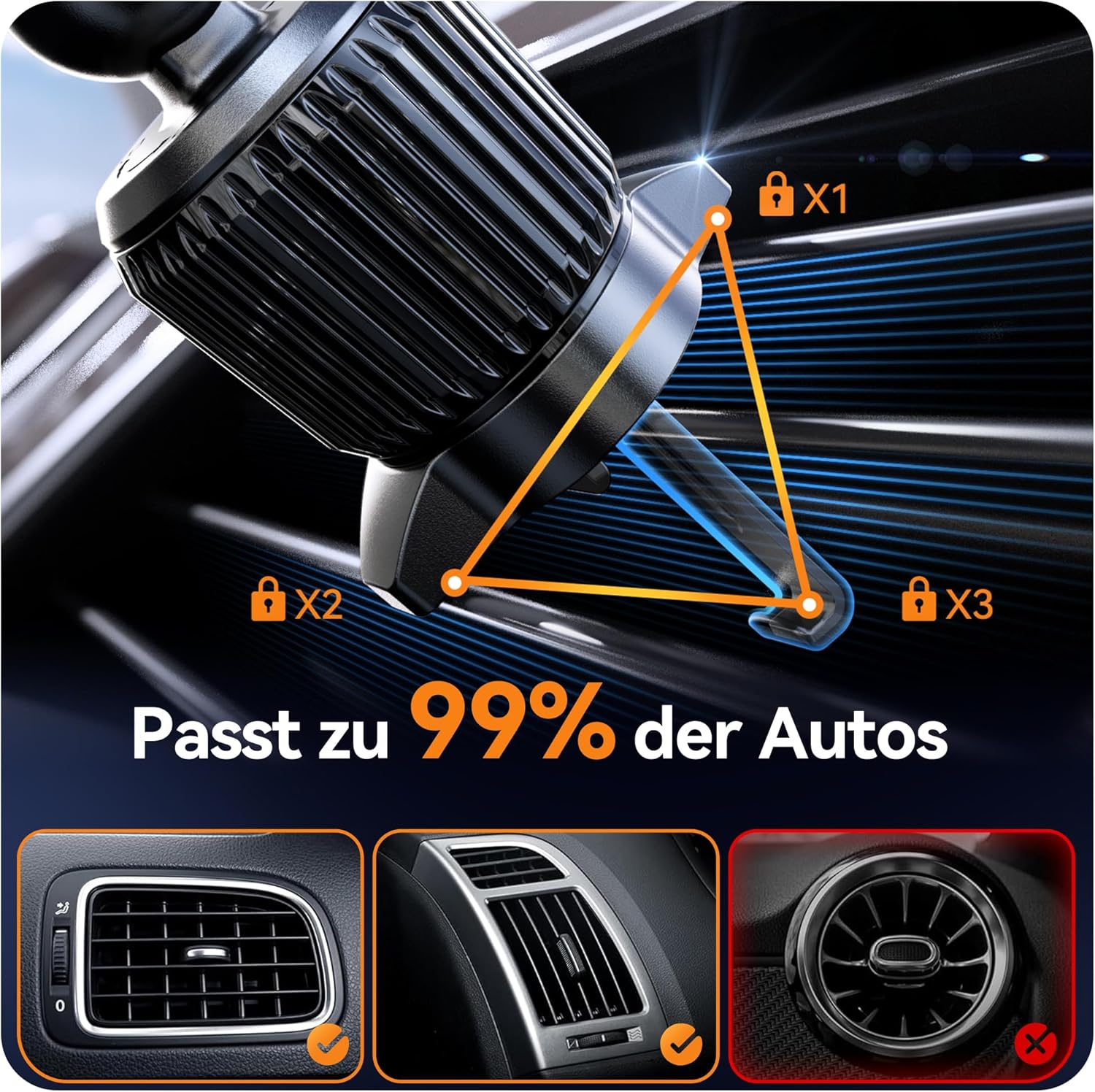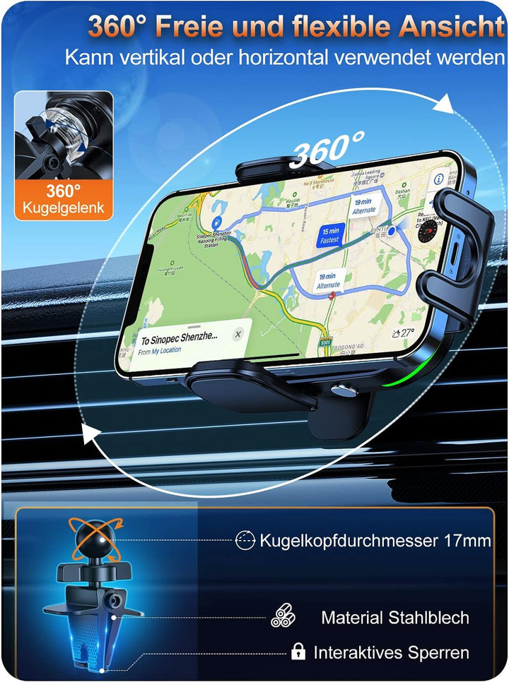 - 🚗【Clip aus Aluminiumlegierung & Verstellbare Palette】 Statt traditionellen Luftauslassklammern aus Kunststoff, verwenden wir Klammern aus reiner Aluminiumlegierung, die unsere Zerstörungsprüfung perfekt bestanden haben. Sie können die Klammern um 360 Grad drehen und der Bildschirm kann im Querformat (horizontal) angezeigt werden. 🚗Die Palette ist streckbar, und es wird empfohlen, die Palette zur geeigneten Skala gemäss der Grösse des Handys einzustellen, um den besten Ladeeffekt zu erzielen.