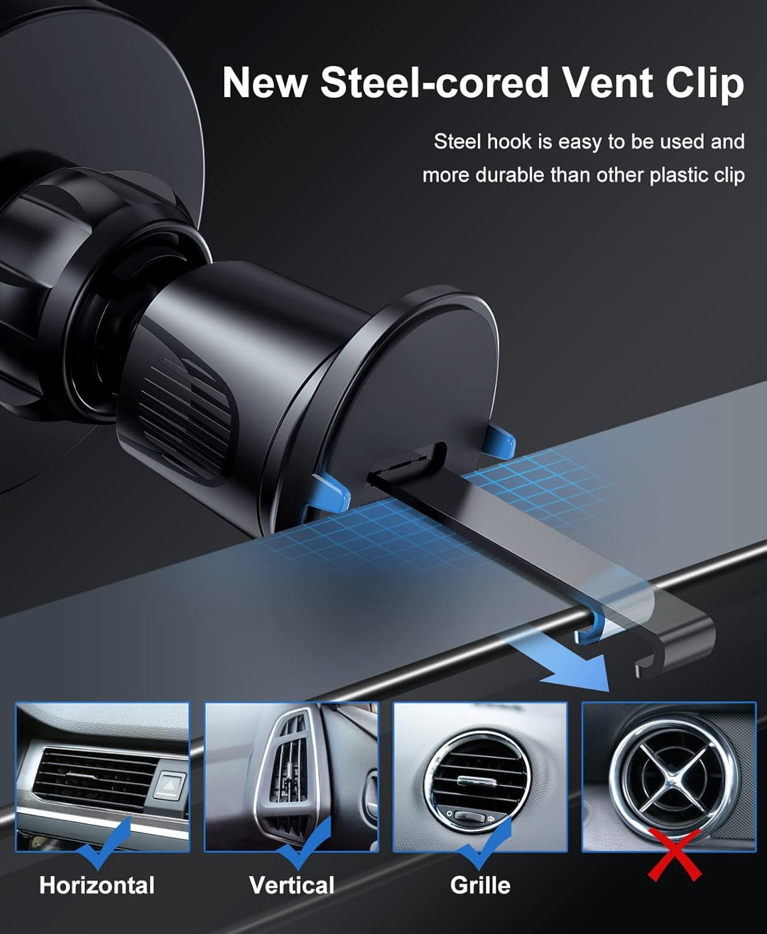 - ⚡【Verbesserter Metallhaken & 360 ° Drehung】Der Lüftungsclip dieser Magsafe Kfz Ladegerät ist mit Metallhaken ausgestattet, die sicher an den Lüftungslamellen befestigt werden können, ohne zu fallen, und eignet sich für die meisten