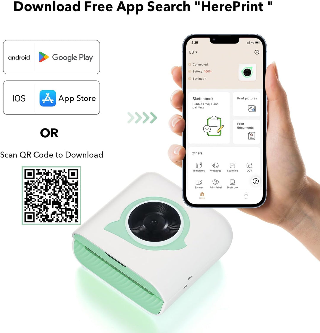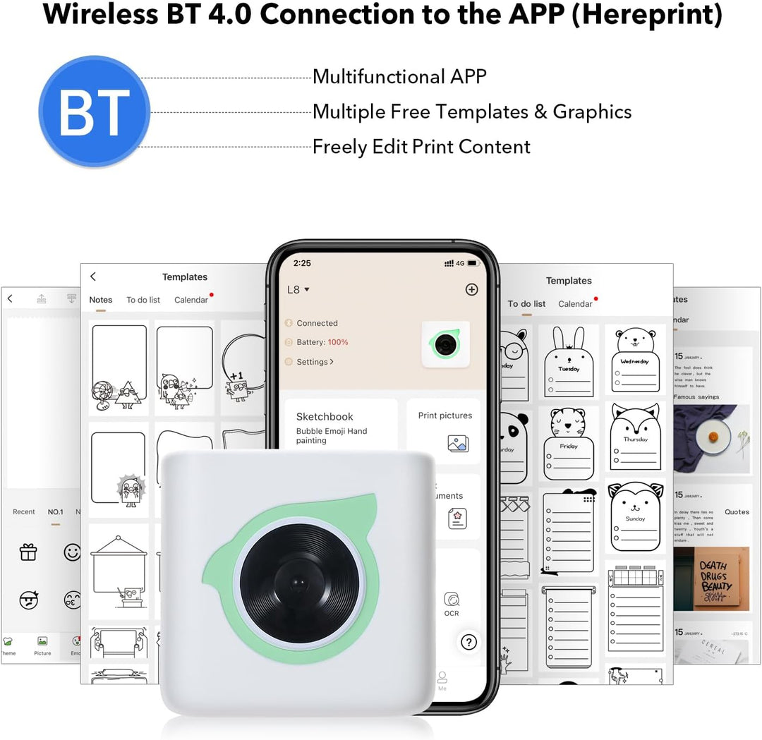 - 【Drucken Sie alles, was Sie möchten】Der L8 Mini-Fotodrucker unterstützt das Drucken von Fotos, Nachrichten, Listen, Barcodes, Handzeichnungen, OCR-Texterkennung, schlechten Fragen, Bannern, Dateien, Webdruck usw. Die APP bietet eine Vielzahl von