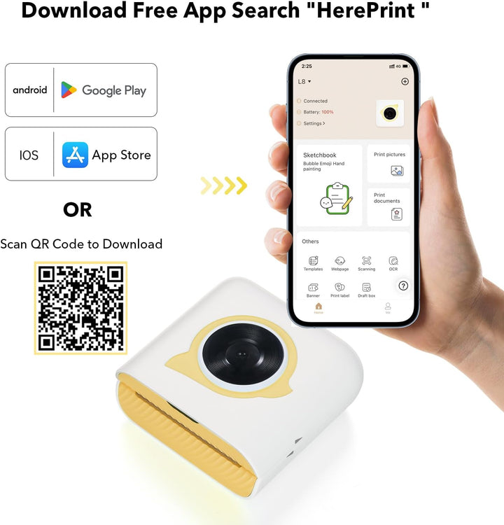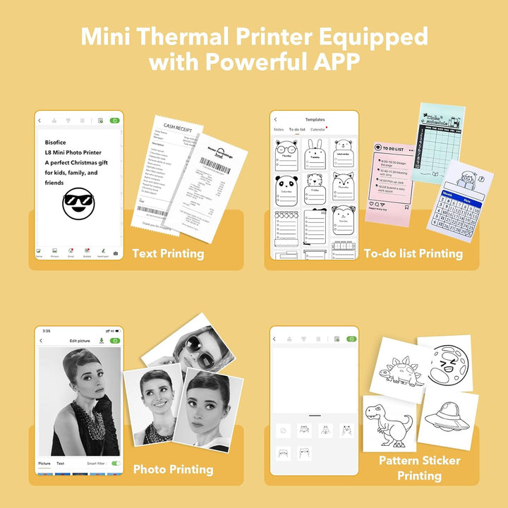 - 【Drucken Sie alles, was Sie möchten】Der L8 Mini-Fotodrucker unterstützt das Drucken von Fotos, Nachrichten, Listen, Barcodes, Handzeichnungen, OCR-Texterkennung, schlechten Fragen, Bannern, Dateien, Webdruck usw. Die APP bietet eine Vielzahl von