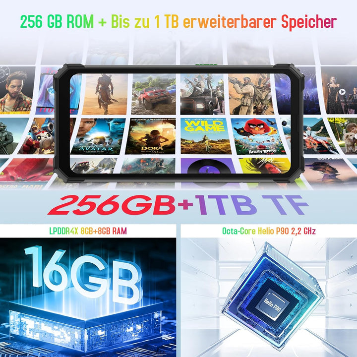 - 🌠【𝟭𝟲𝗚𝗕+𝟮𝟱𝟲𝗚𝗕 𝗚𝗿𝗼ss𝗲𝗿 𝗦𝗽𝗲𝗶𝗰𝗵𝗲𝗿, 𝟮.𝟮 𝗚𝗵𝘇 𝗛𝗲𝗹𝗶𝗼 𝗣𝟵𝟬】: Erlebe unvergleichliche Leistung, denn dieses robuste Smartphone verfügt über den