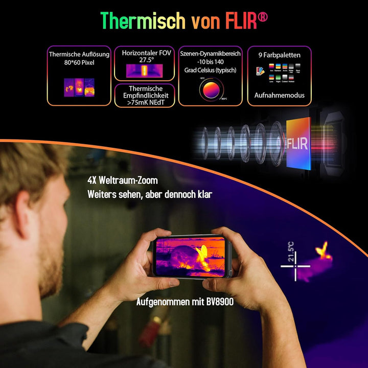 - Das Outdoor-Smartphone bietet mit dem massgeschneiderten Flir-Wärmesensor einen 4-fachen Zoom ohne Qualitätsverlust und ermöglicht es Ihnen, die Temperatur in einem grösseren Bereich intuitiv zu beobachten. Versteckte Tiere im Wald, Stau in der Ecke