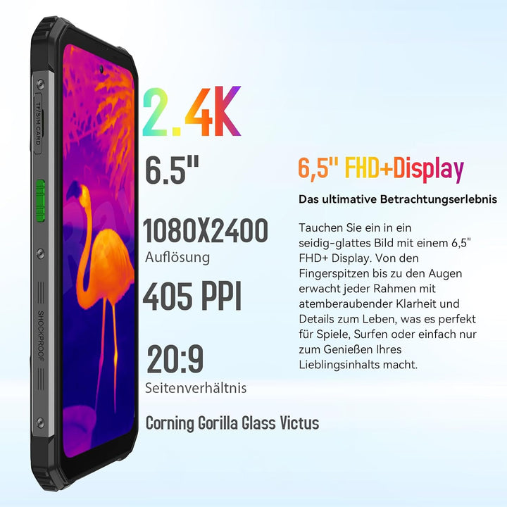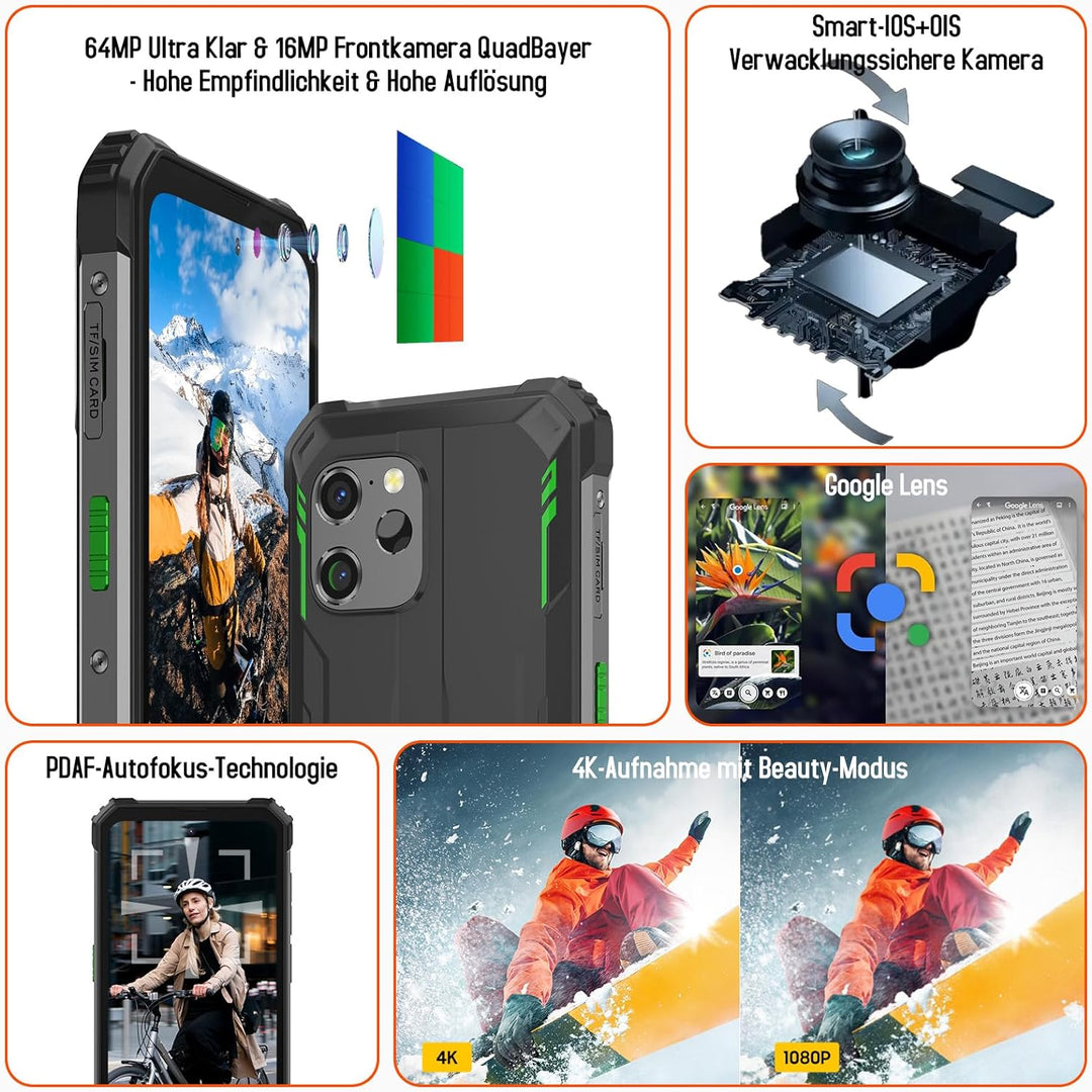 - Das Outdoor-Smartphone verfügt über eine 64MP ISOCELL GW3 Hauptkamera, die für authentische Farben in jeder Landschaft sorgt. Das optische Bildstabilisierungssystem sorgt für scharfe Fotos und Videos auch bei wackeligen Bedingungen. Smart ISO und